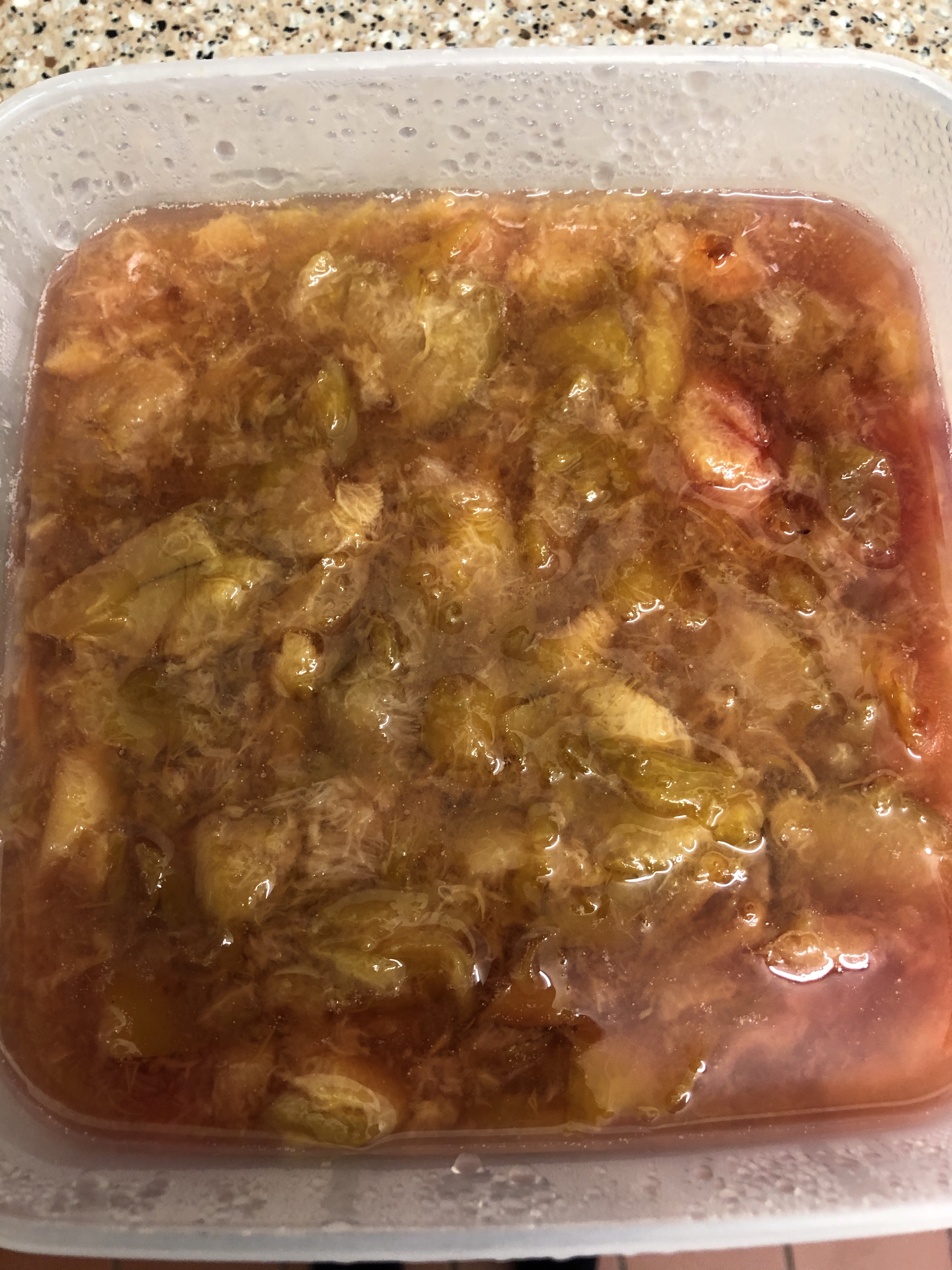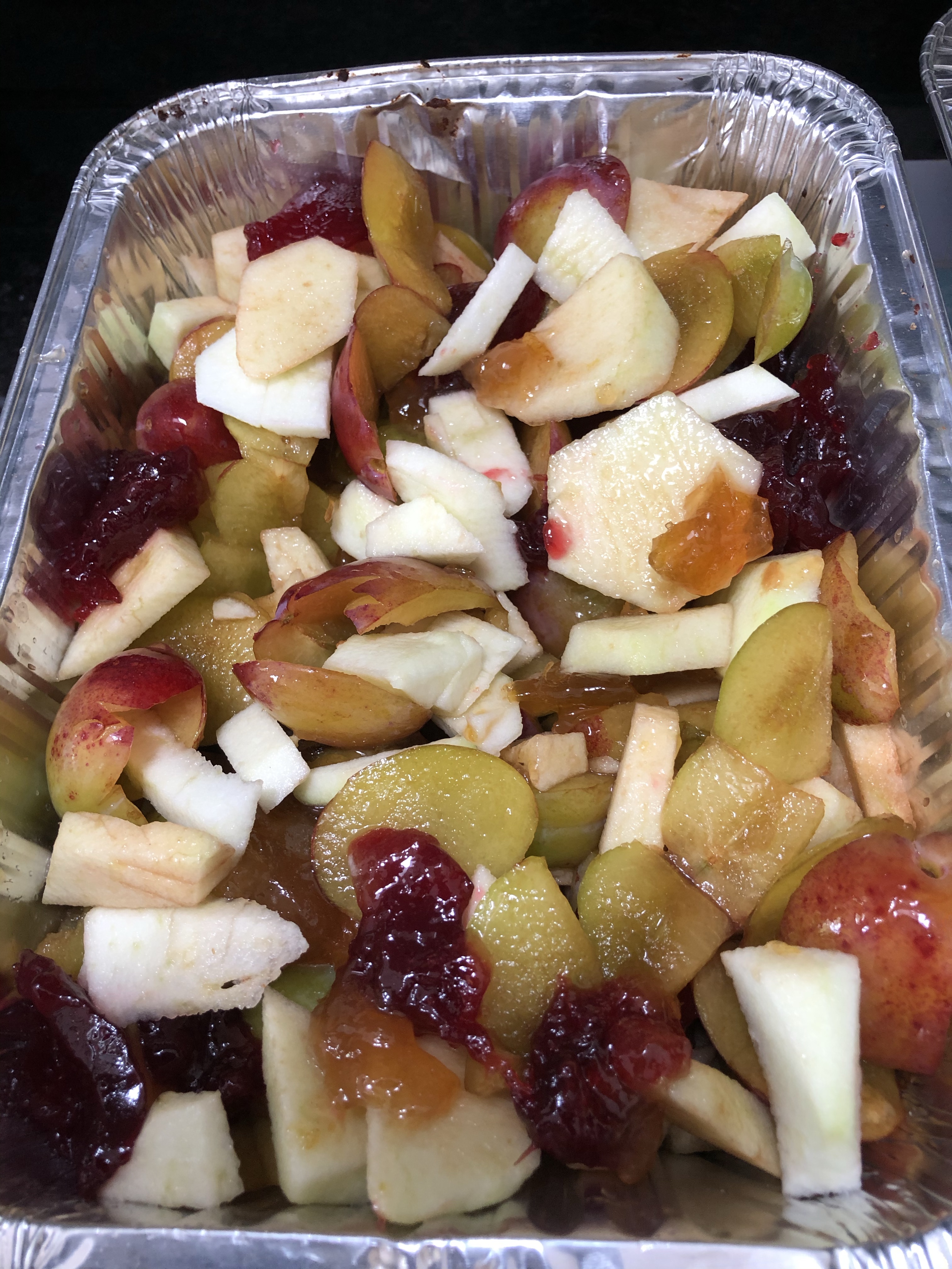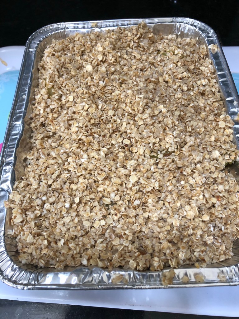 Peel and slice and dot with plum jam. Cover with oat mixture and pop in the oven