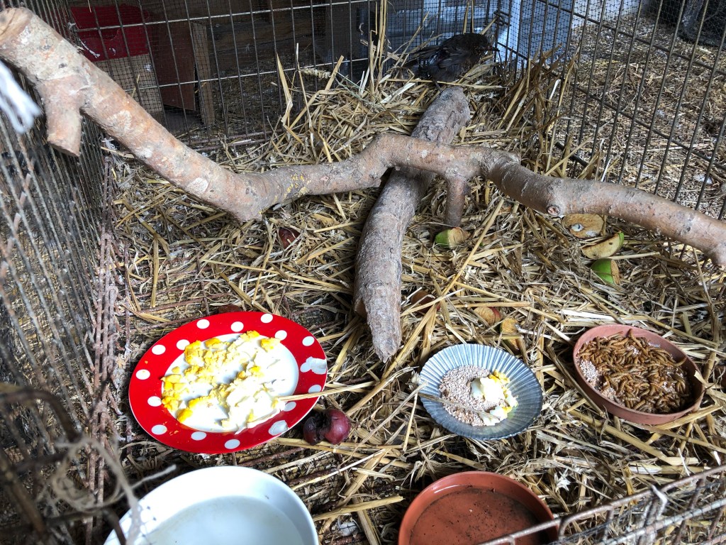 Hard boiled egg, chick crumbs, plums and apples and a fresh supply of mealworms that I just collected from our friends in Keysoe. Here’s hoping she will be tempted to eat and put on the weight she needs to survive