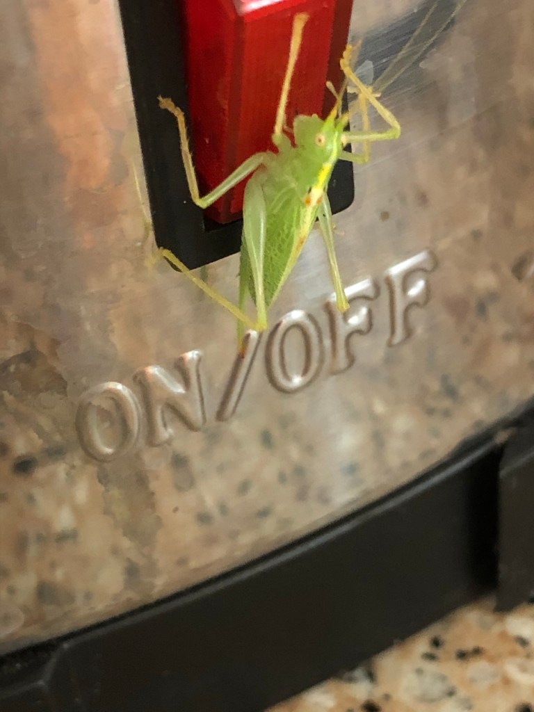 I picked 6 kilos of plums this morning to sell to the Blackcat farm shop. As I was sorting the fruit out jumped this little creature with the unusual name of a Drumming Katydid (also known as the oak bush cricket). Jeremy caught him mid jump and deposited him safely outside.