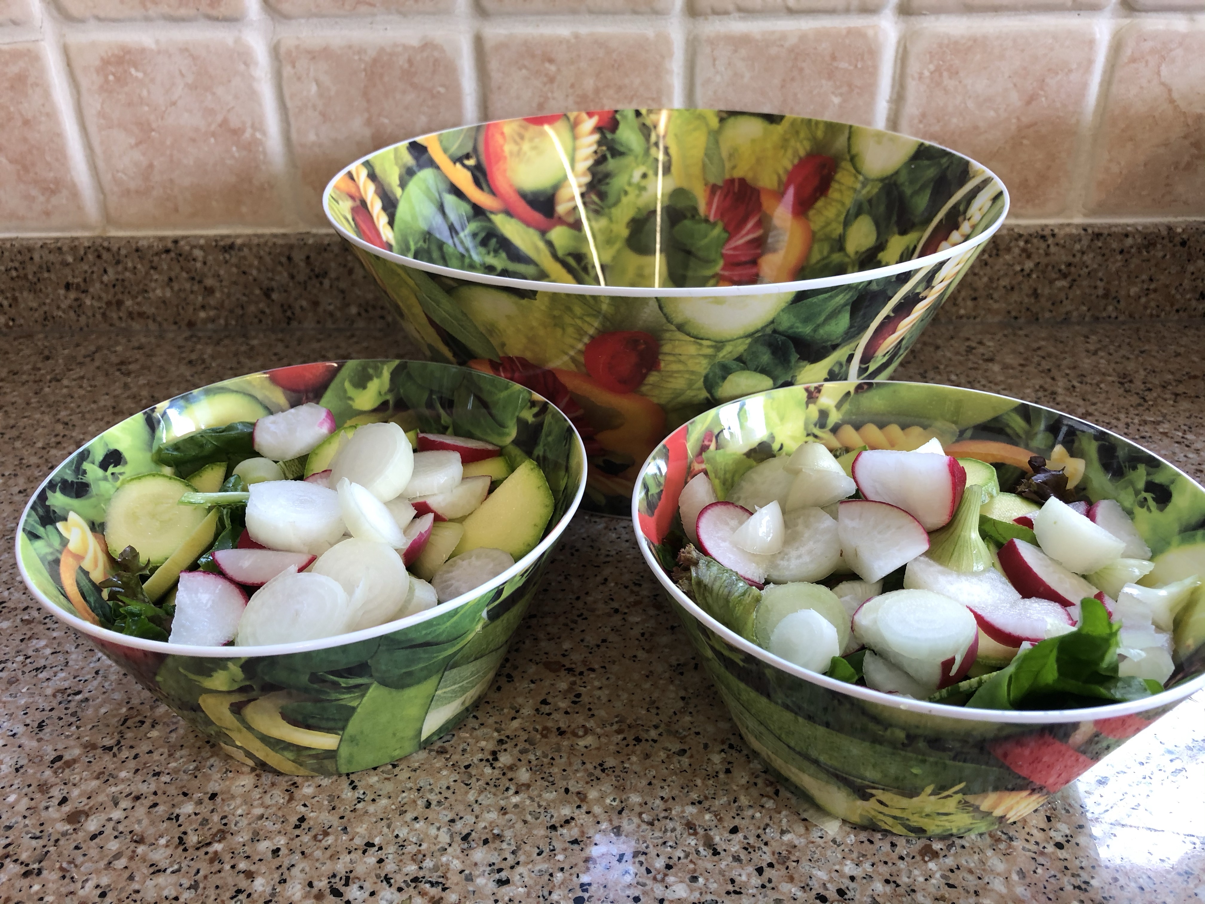 It’s my favourite item in our kitchen and I have been searching, without success, for another. I went onto eBay on Sunday and there was a similar melamine bowl plus two small bowls. Not the same print, but this time a salad pattern. They arrived yesterday and I love them!