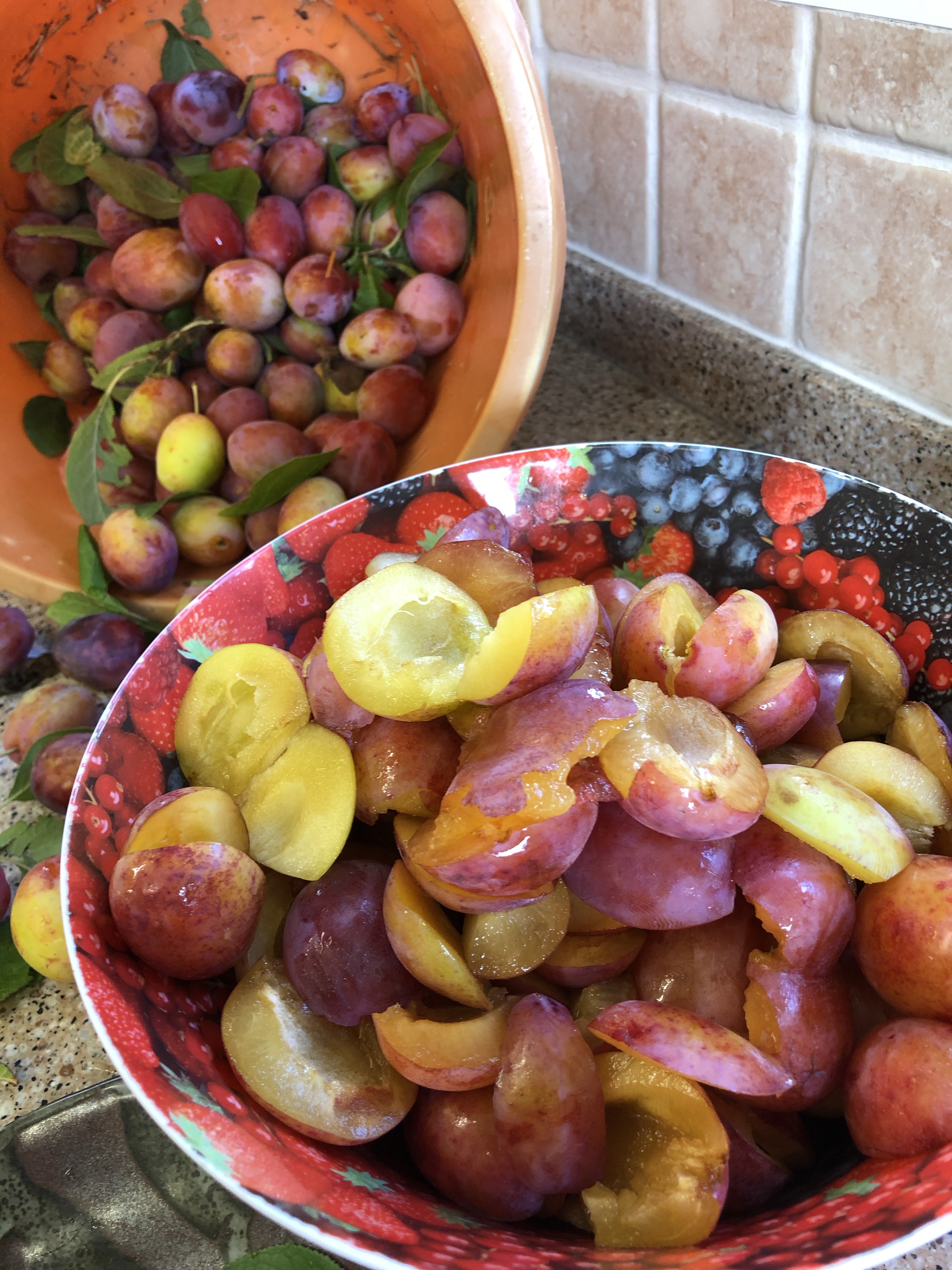 Several years ago our friends, SF and MF, bought us a melamine bowl decorated with a soft fruit and strawberry print. It seemed an unusual present at the time but I use that bowl every single day. I mix cakes in it, I pick tomatoes in it and this morning I cut plums into it, preparing them for the freezer.