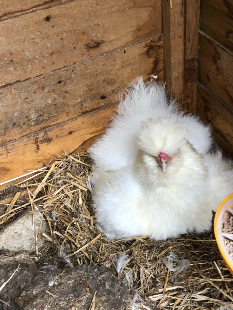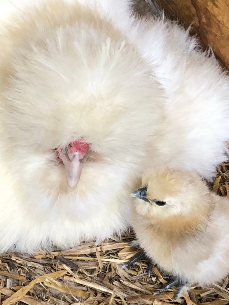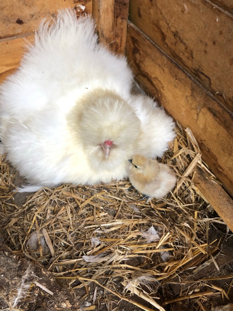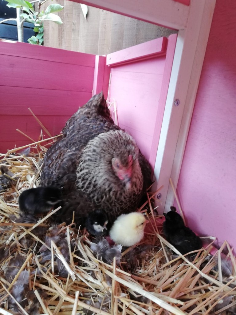 One of our birds (who we gave to Di) sat on some Gables eggs and this morning there are baby chicks. It’s all about chicks today