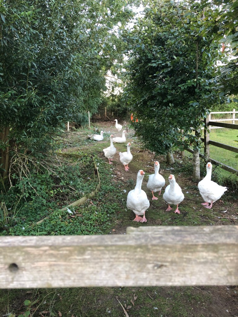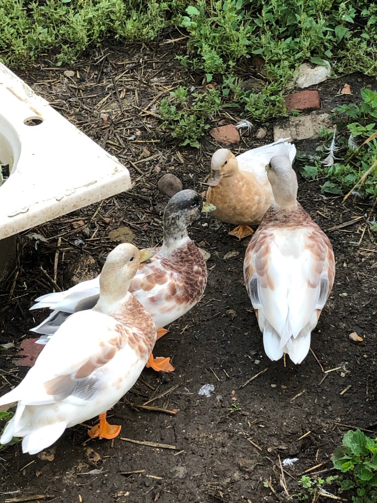 When we forget to clip the duck wings they fly out of their enclosure – and surprise themselves. They happily return to their run, their bath and the safety of the duck house.