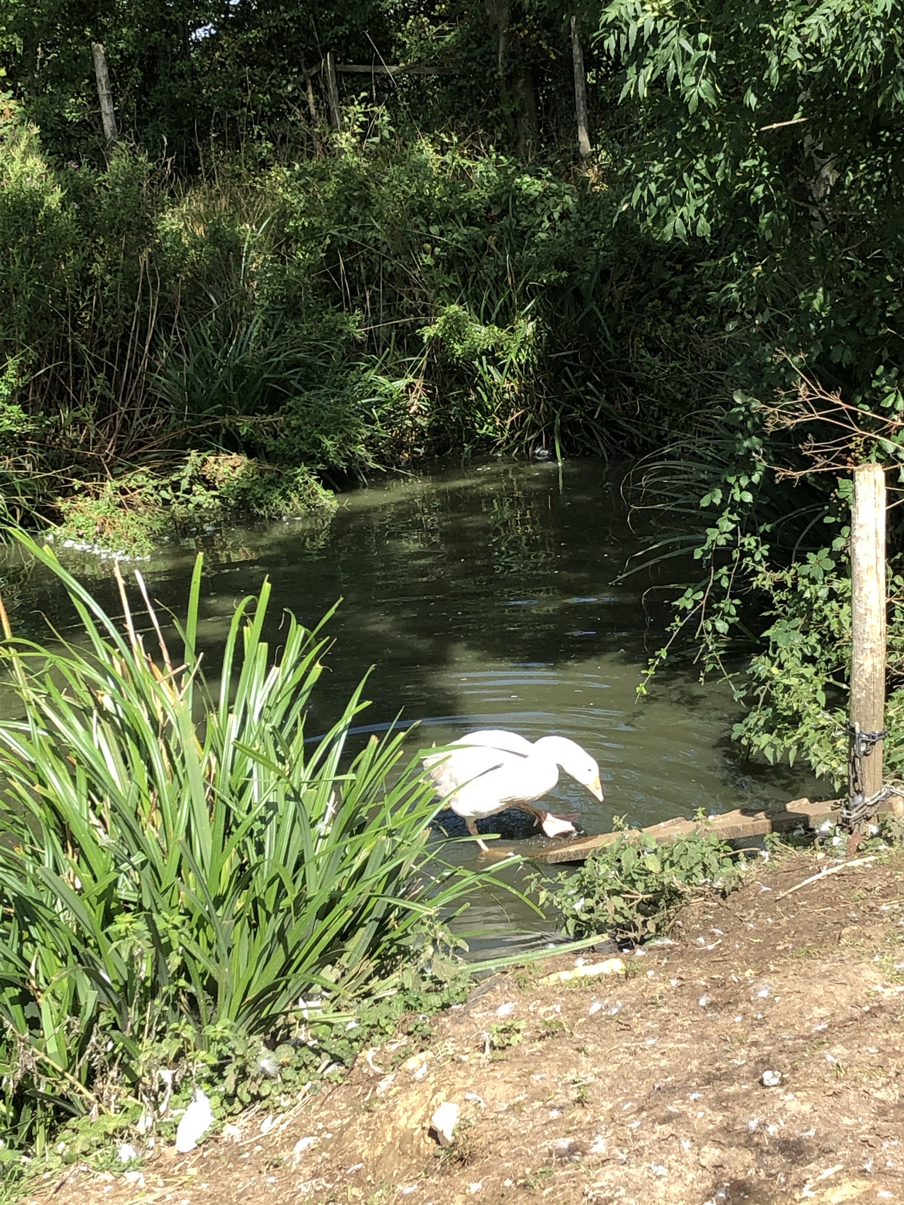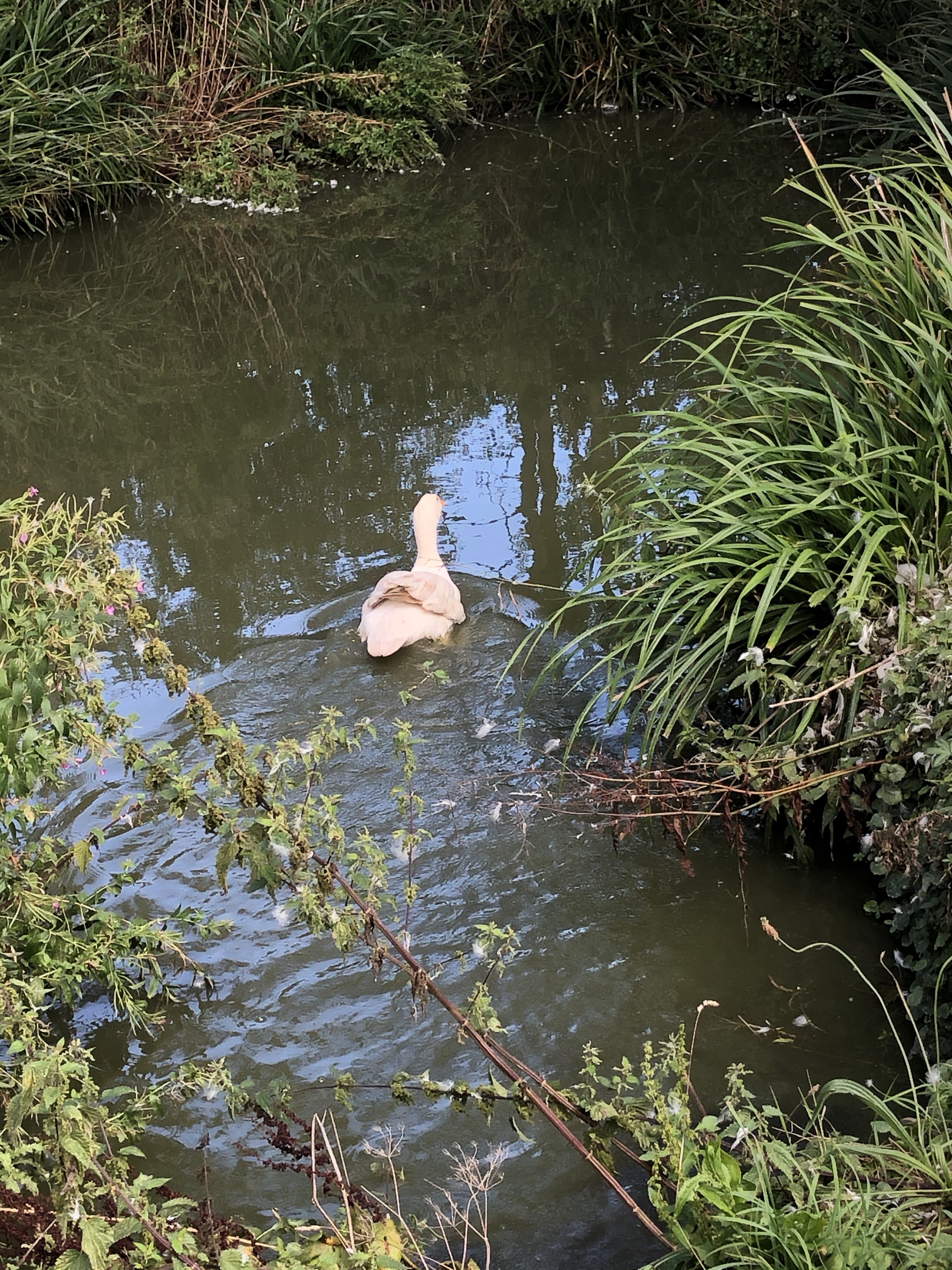 The two goslings have spent the last fortnight hiding in the undergrowth around the edge of the goose pond. Too frightened of the big birds they paddled in the water and never ventured onto dry land. Yesterday Jeremy found one of them on the bank bravely facing some pecking from the adults. The other bird remained in the water. When I returned from London this afternoon I went down to the pond. The brave teenager was managing quite well but the other bird was hiding. I found her and used a stick to encourage out of the undergrowth.