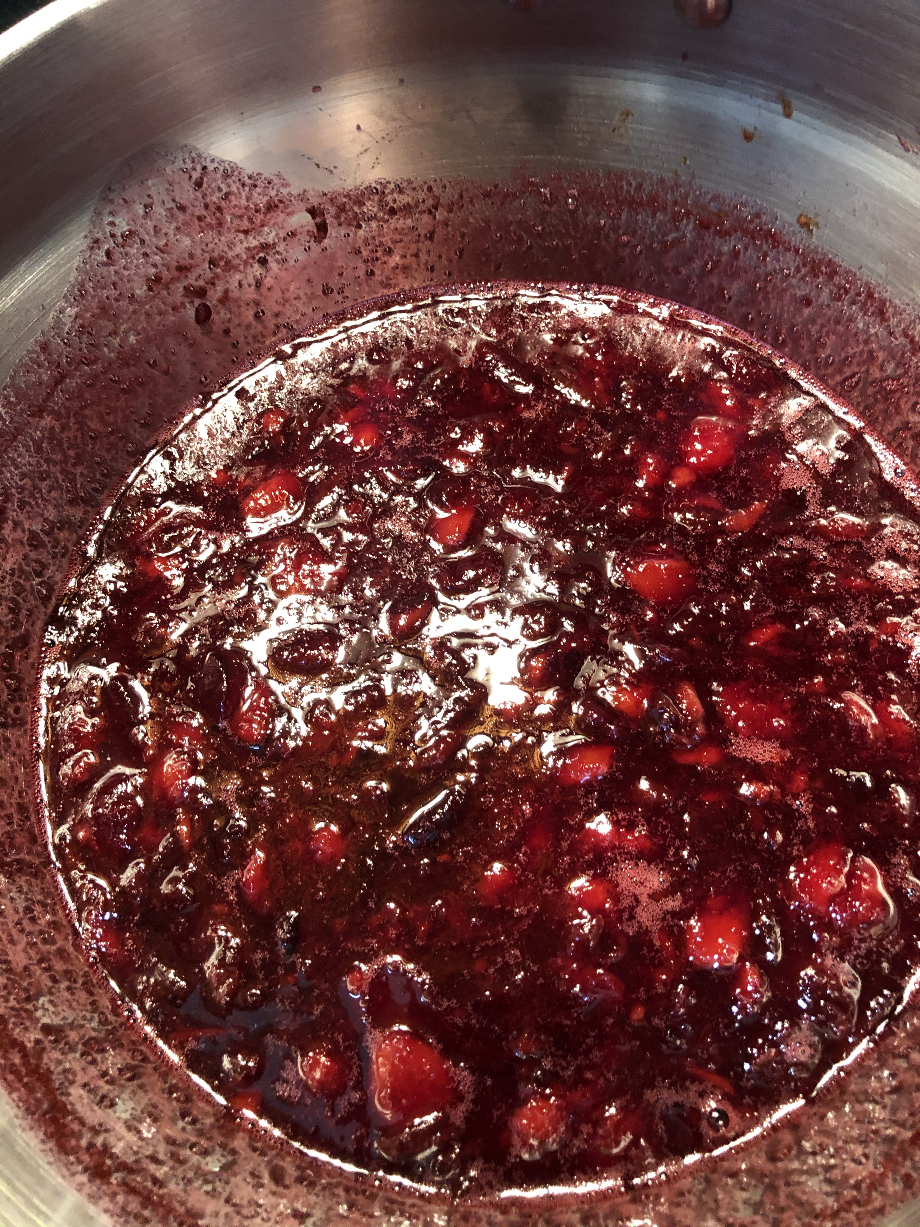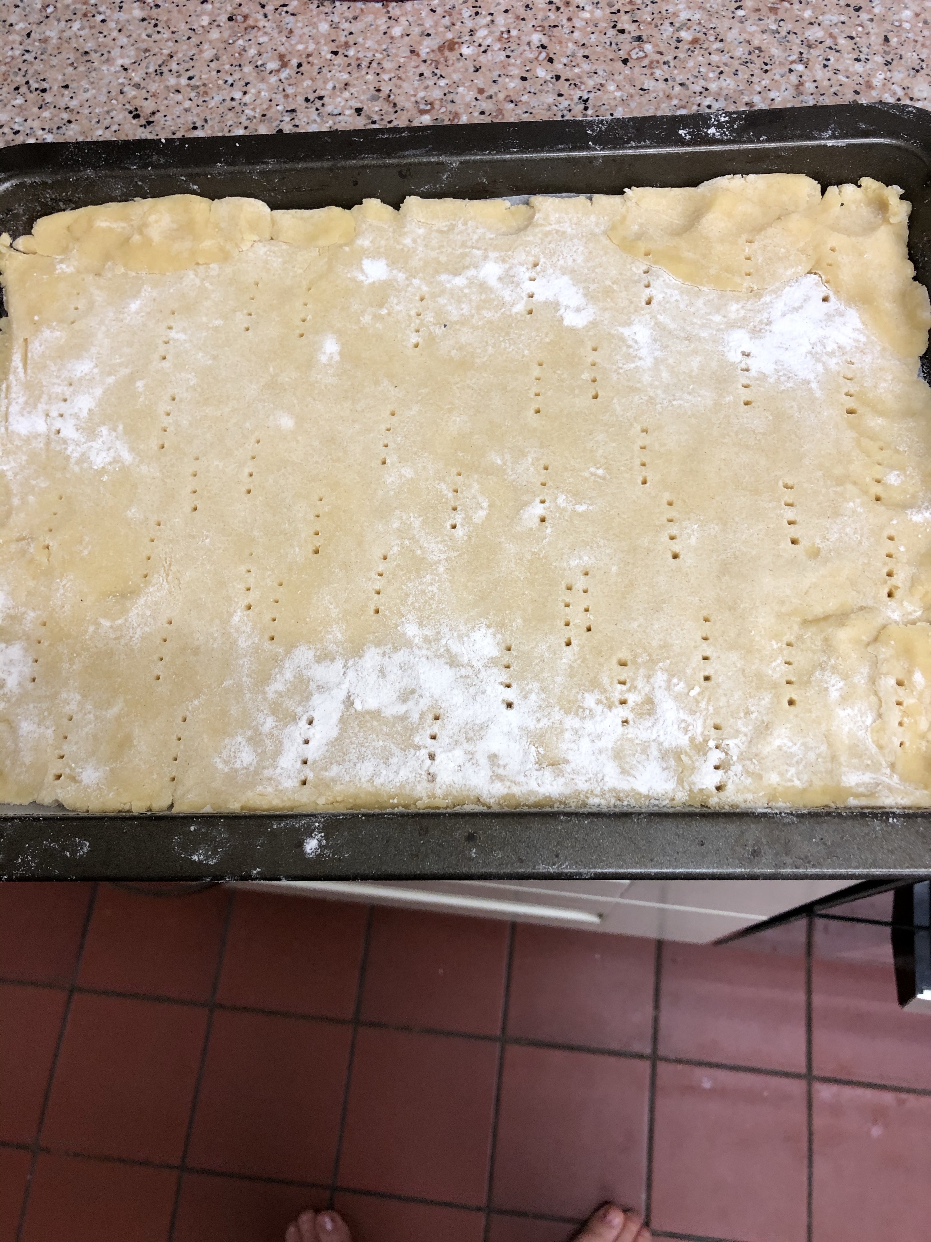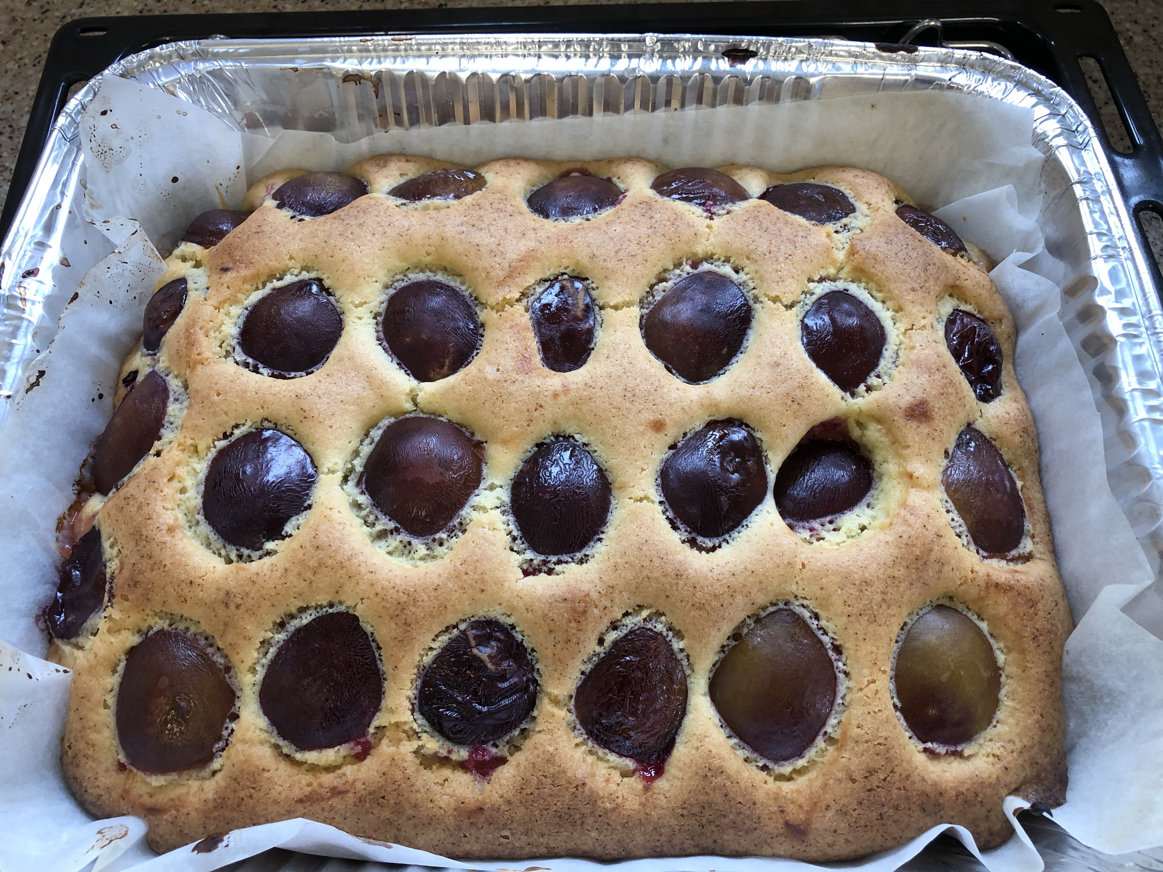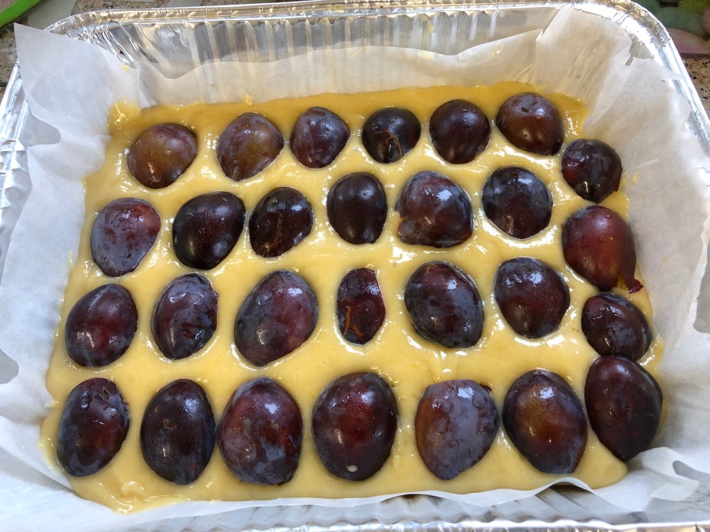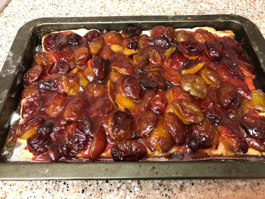 Topped with zwetschen purple plums and a sprinkle of sugar and baked for a further 20 minutes and then brushed with a damson jam glaze