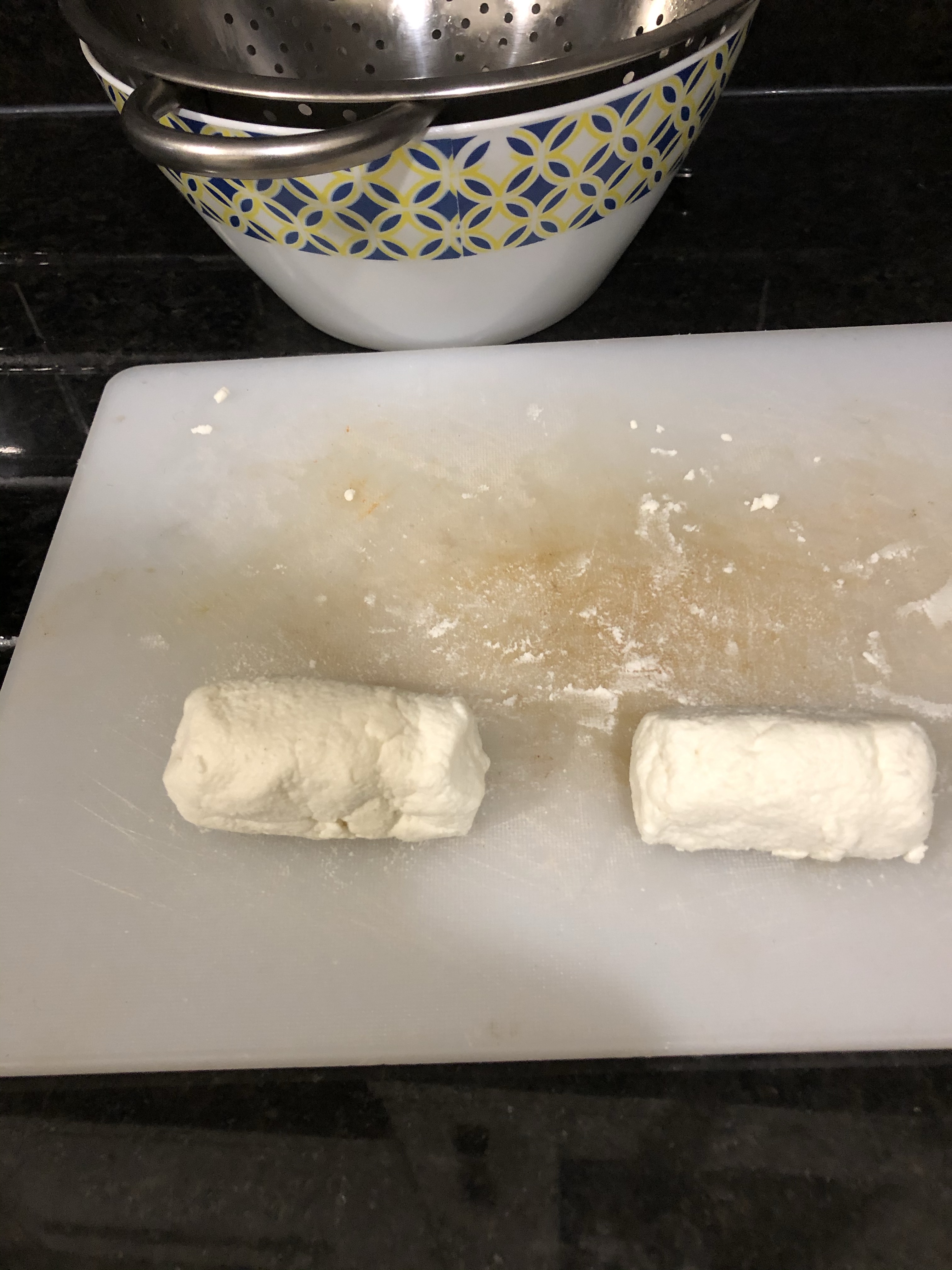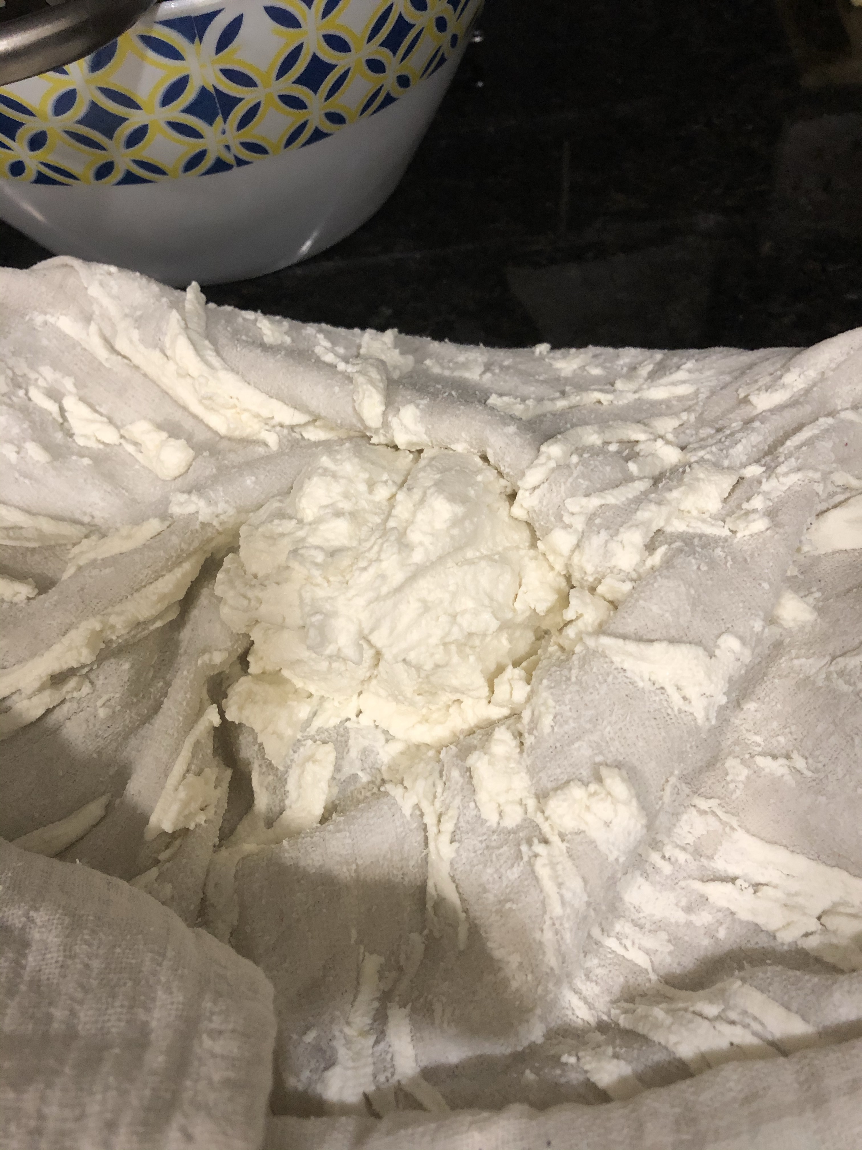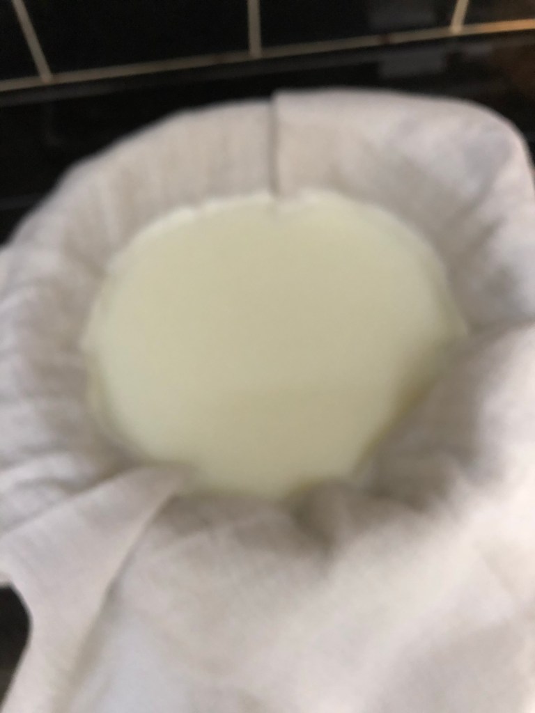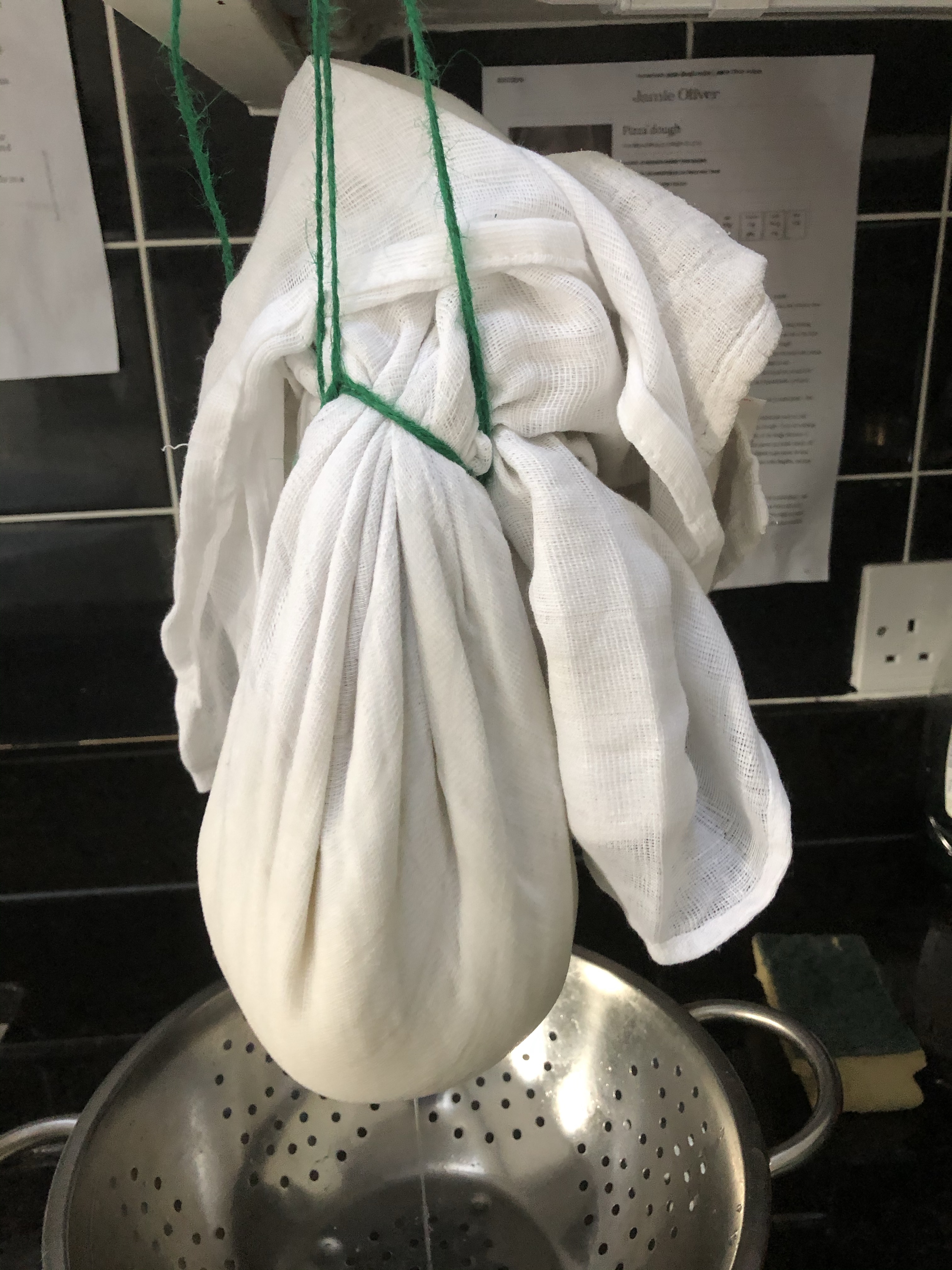 Tie up and leave to drip over a bowl. The whey will gather below and the curds remain in the cloth