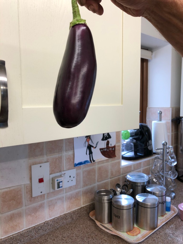 And the first aubergine emerges from the poly tunnel
