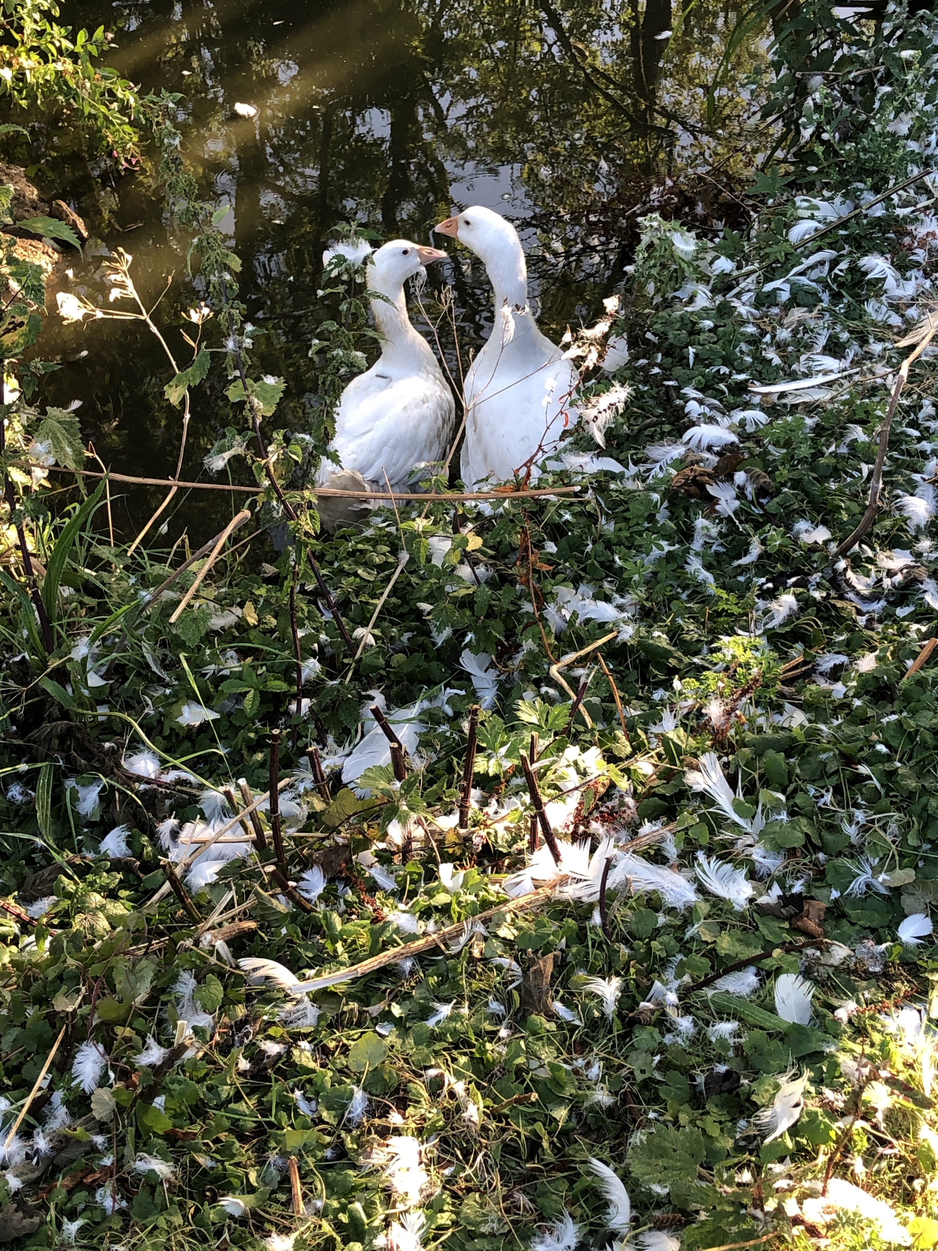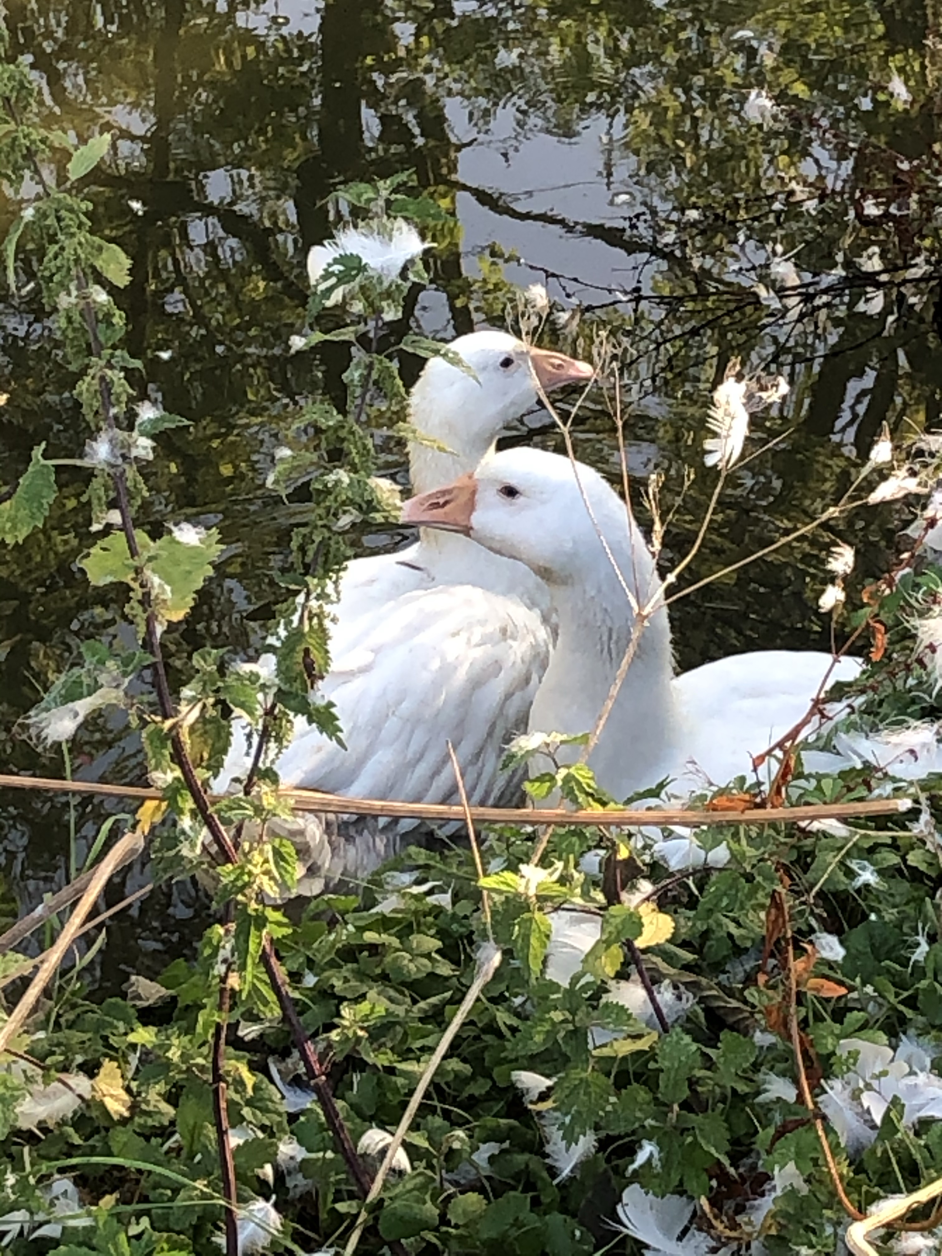 The goslings have spent their second night at the pond. Not yet part of the flock they, thankfully, have each other and they have ventured into the shallow water.