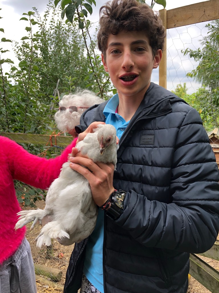 We left them at the house while I went to class and Jeremy went to see his Bee keeping teacher to buy ten jars of honey. When Jeremy returned not only were the bike riders here but out expected tea time guests were already looking at the garden and animals.