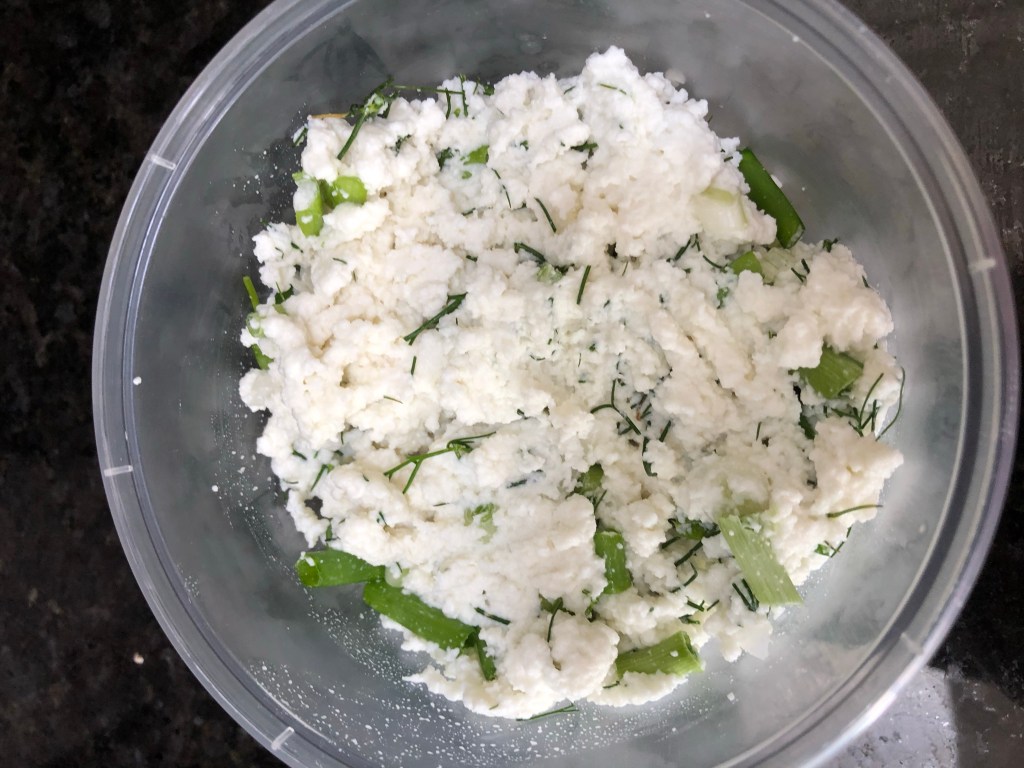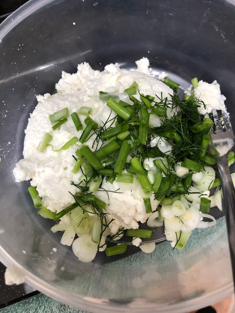 Heat four pints of goats milk stirring as it reaches 160 degrees or slightly hotter. Take off the heat and add a quarter of a cup of apple cider vinegar and leave to curdle for half an hour. Pour the whey from the top into the sink and then pour the remaining curds and whey into a sieve lined with cheesecloth. Give quite a few squeezes to speed up the process and then leave to drain some more for an hour. Meanwhile pick some dill and spring onions and clean and chop them. Add them with some salt to the farmer’s cheese