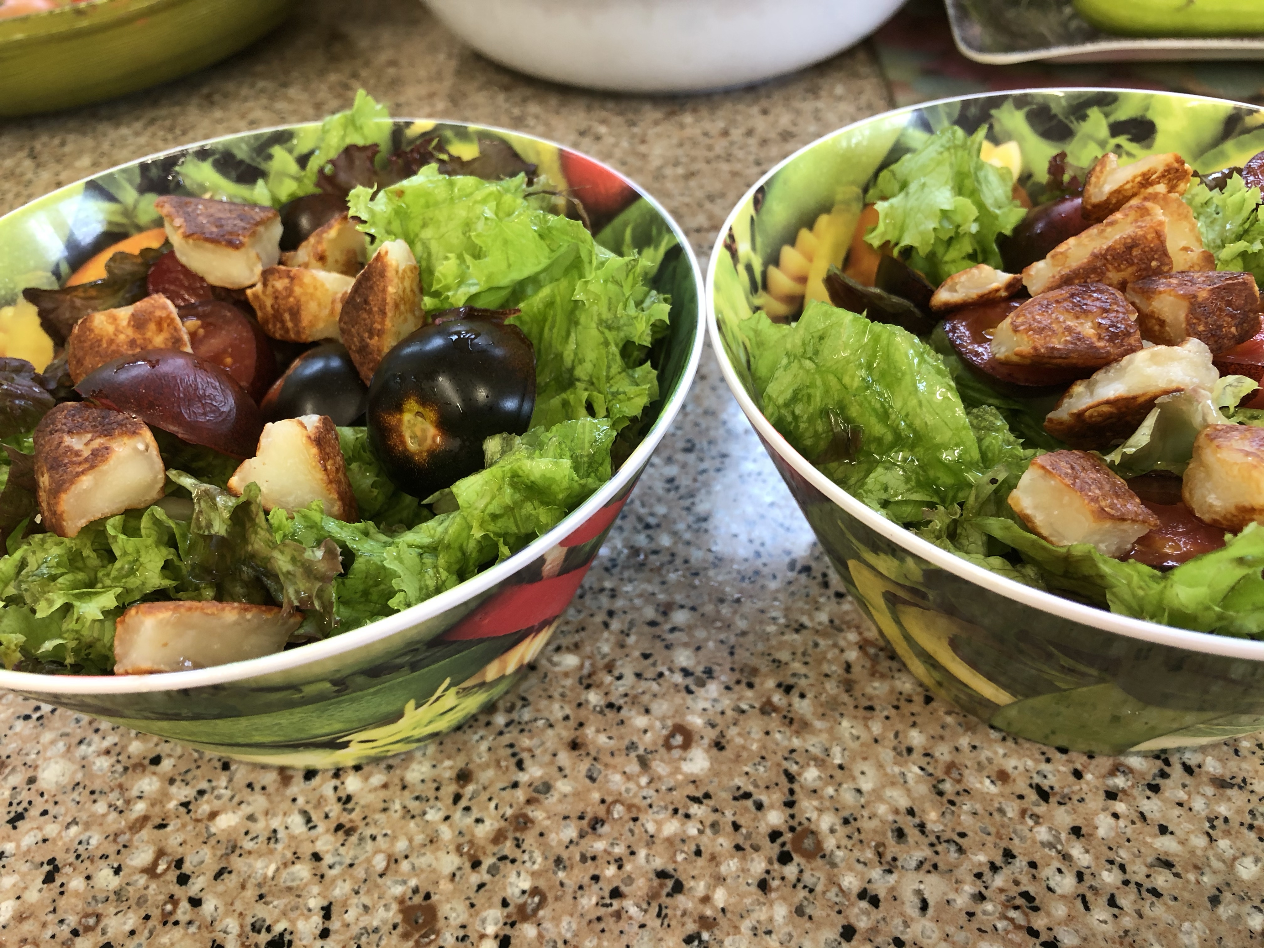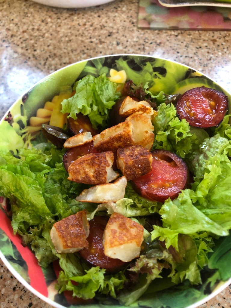 Has now become a side salad with indigo cherry tomatoes (so tasty but, sadly, not prolific growers) and fried haloumi on top.