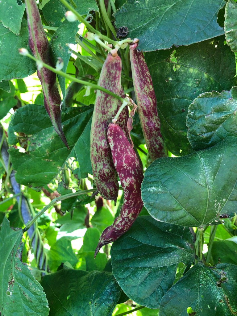 The Borlotti beans are fattening inside the pods. When the pods begin to wither we will strip out the beans and dry them in the airing cupboard