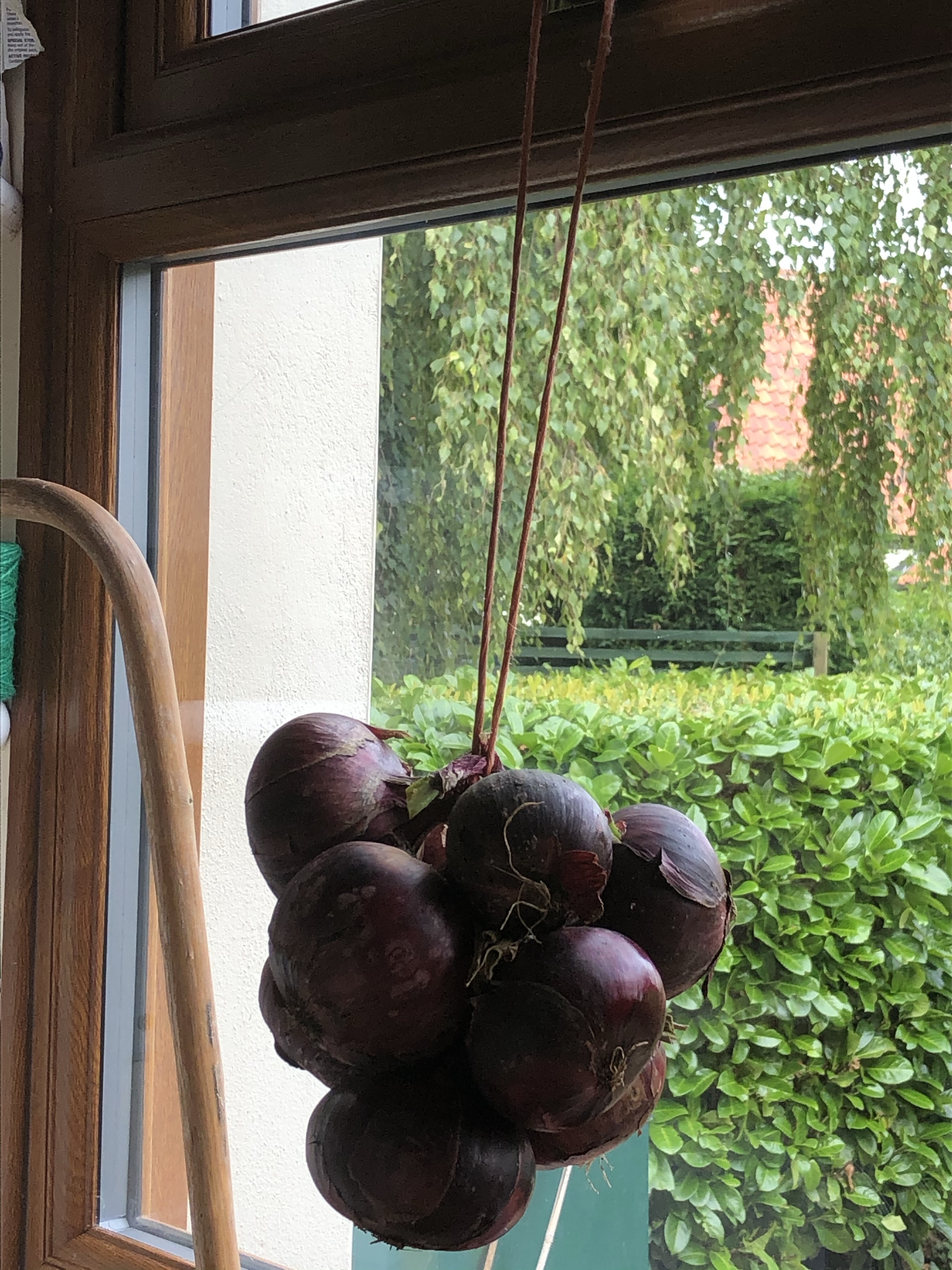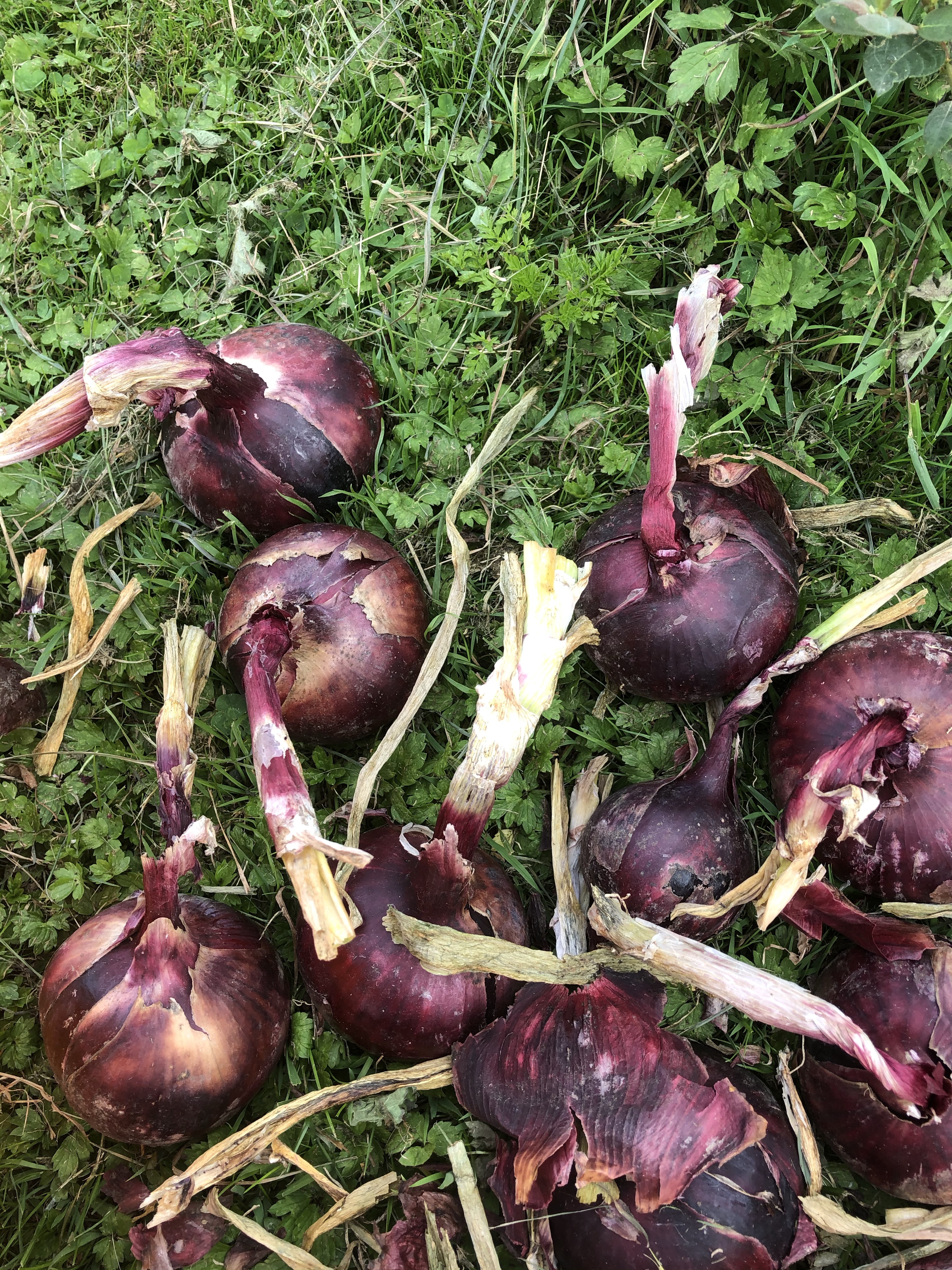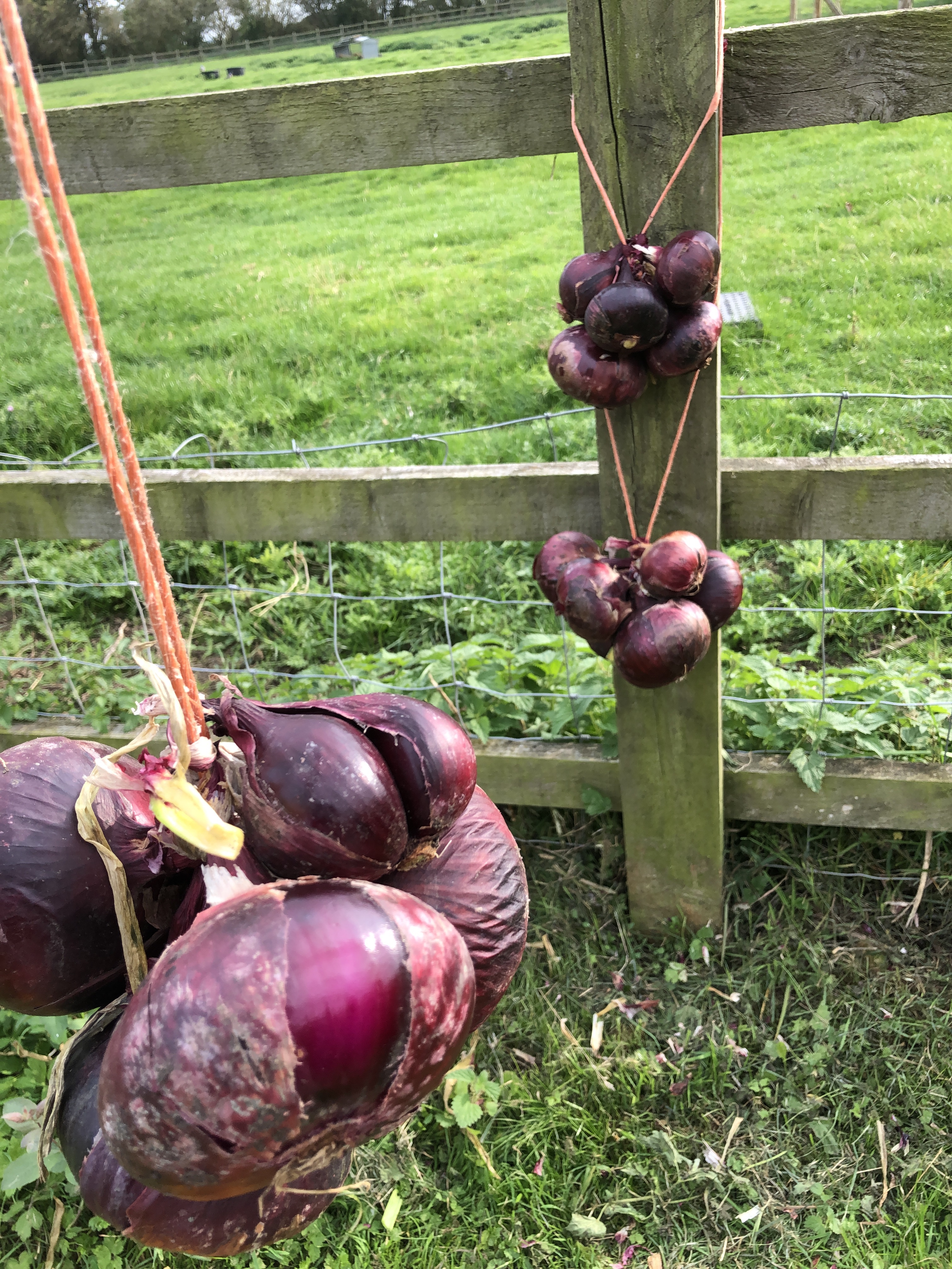 We have a huge crop of red and white onions (two varieties of whites) and if the temperature in the onion barn is cool they should last until the spring or beyond