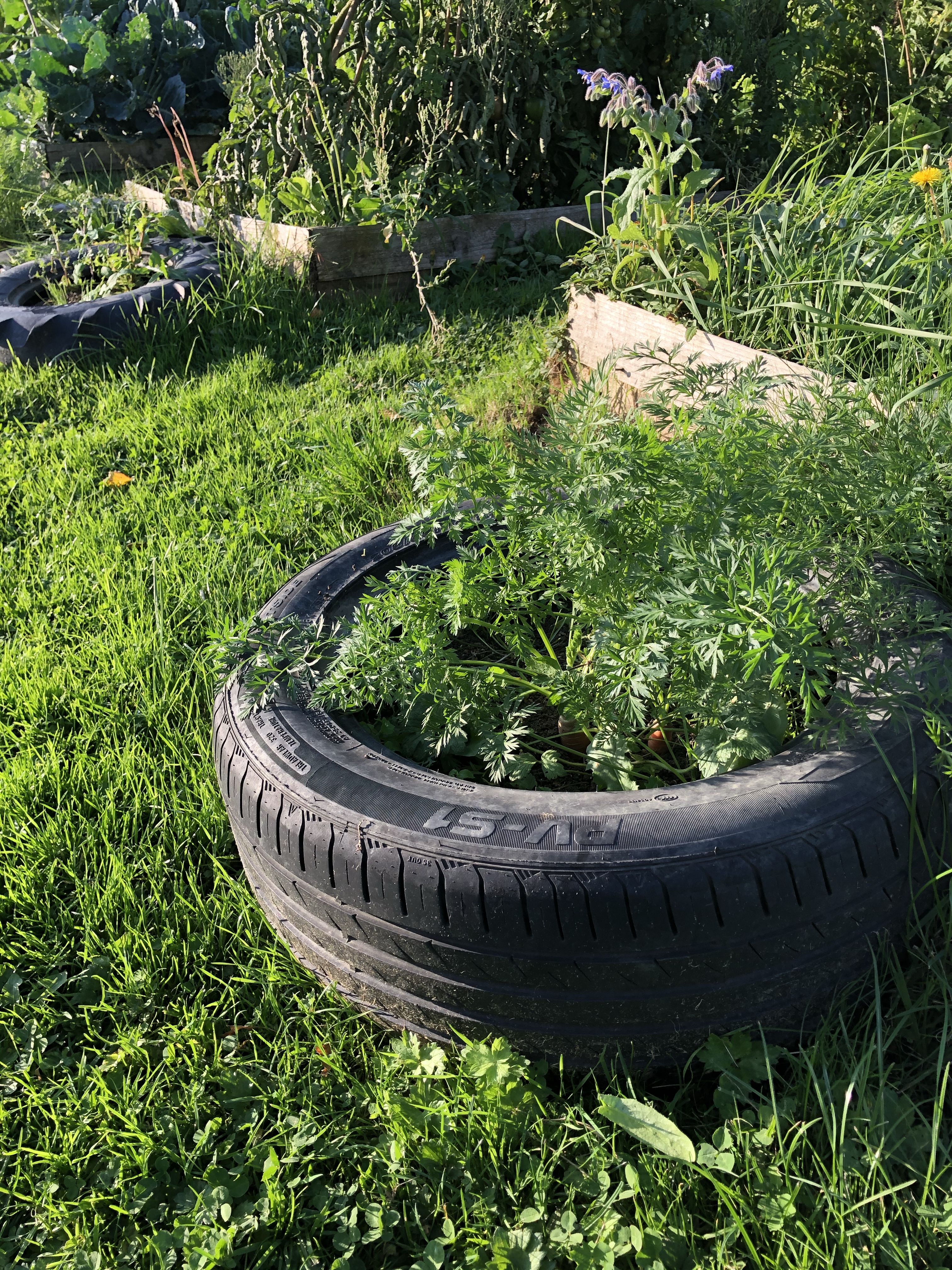 Out in the garden we are using tyres that are regularly fly tipped along Mill Road. We pick them up, bring them home, fill them with mole earth and soil and grow carrots in them.