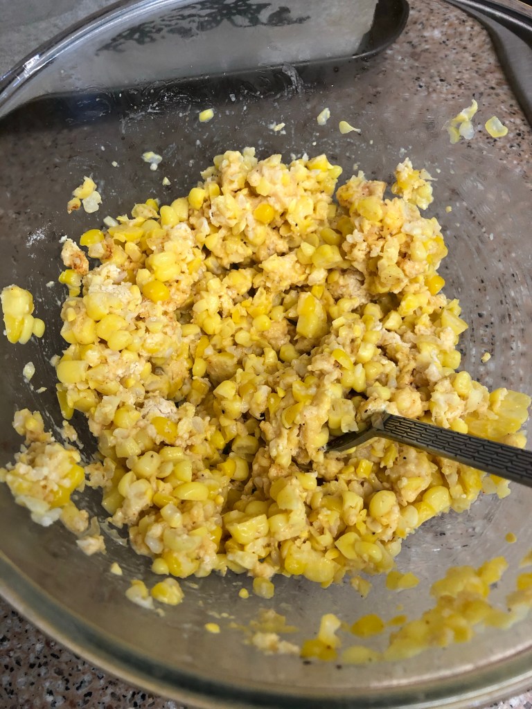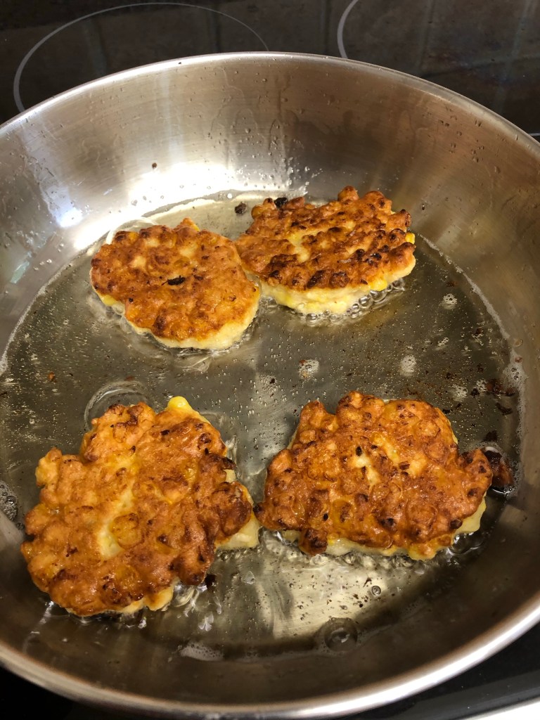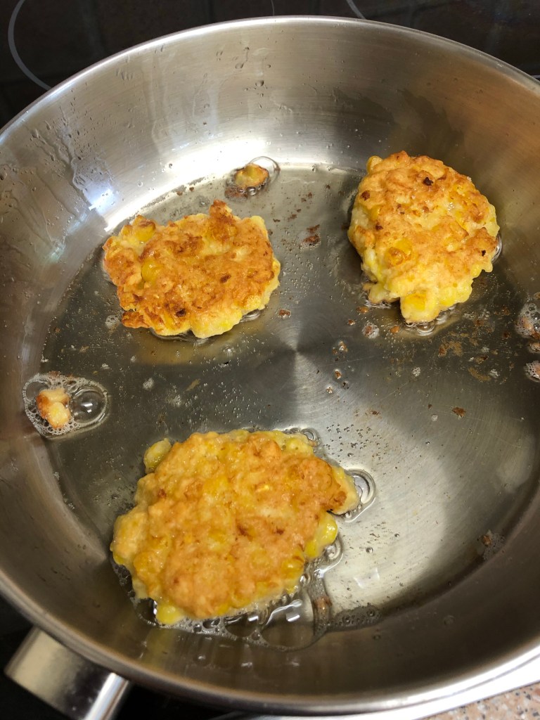 Pick the cornBoil two corns and scrape the kernels from the cobs. Then mix with two egg yolks and some flour and plenty of seasoning Best the two egg whites until stiff and fold into the mixture Fry in hot shallow oil until golden and crispy Drain on kitchen paper and keep your hands off them until supper time!