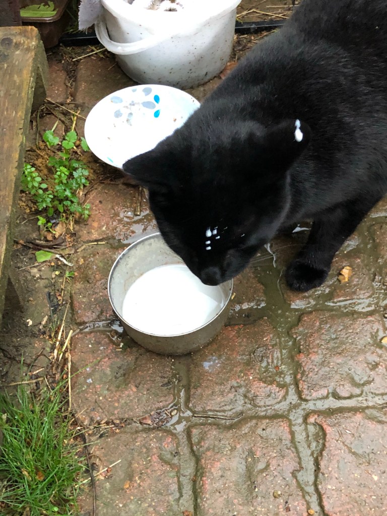 A cat waits for his share of the milk from the cup