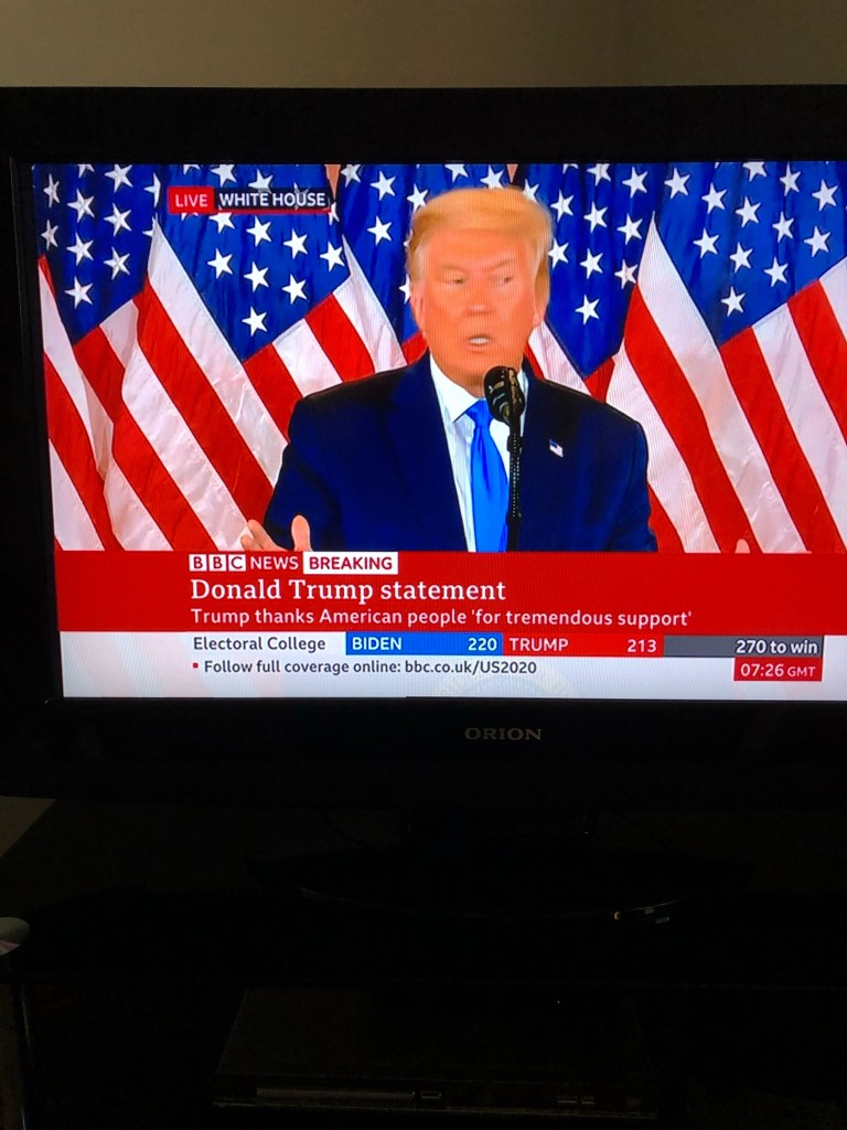 November 4, 2020 by gfreedman2013 The “madman” is announcing a major fraud (and his own victory). So this is democracy! I am off out to talk sense with the animals. Share this: Share on X (Opens in new window) X Share on Facebook (Opens in new window) Facebook Like Loading... Related