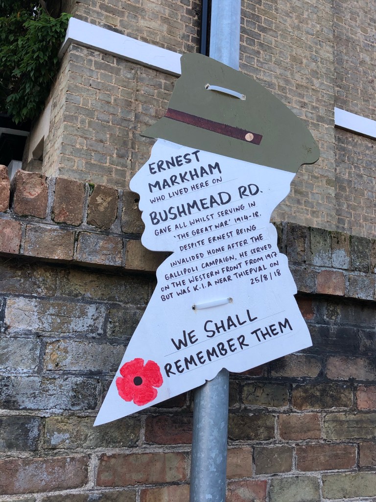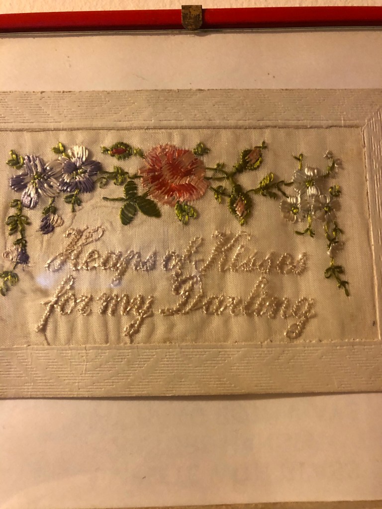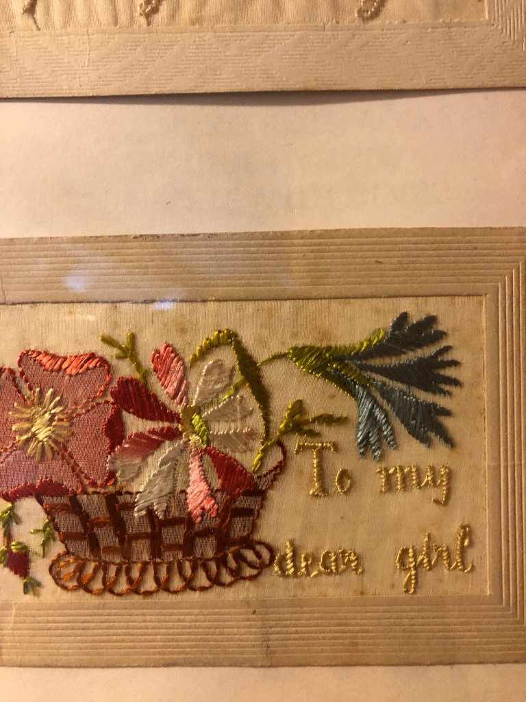 A small, socially distanced service of remembrance will take place in Colmworth Country Park this morning. We have been asked to wear face masks. I will be reciting a memorial prayer in Hebrew and English and I will, as always, think of my paternal grandfather, Sam, who survived the Battle of the Somme. He used to talk to my brother of sleeping in the trenches and how rats ram over the men as they lay in the muddy pits. I have no doubt that his experiences of that war shaped the rest of his life. His wife, my grandma, lost her first boyfriend in that conflict. A New Zealand farmer’s son thousands of miles from home killed on a foreign field. These embroidered postcards are two of the three he sent Katy from France