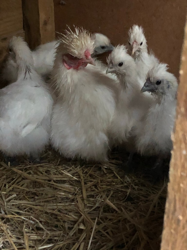 Outside the Silkie chicks and mum had taken themselves to bed, snuggling down into the dry straw I put in their house this morning.