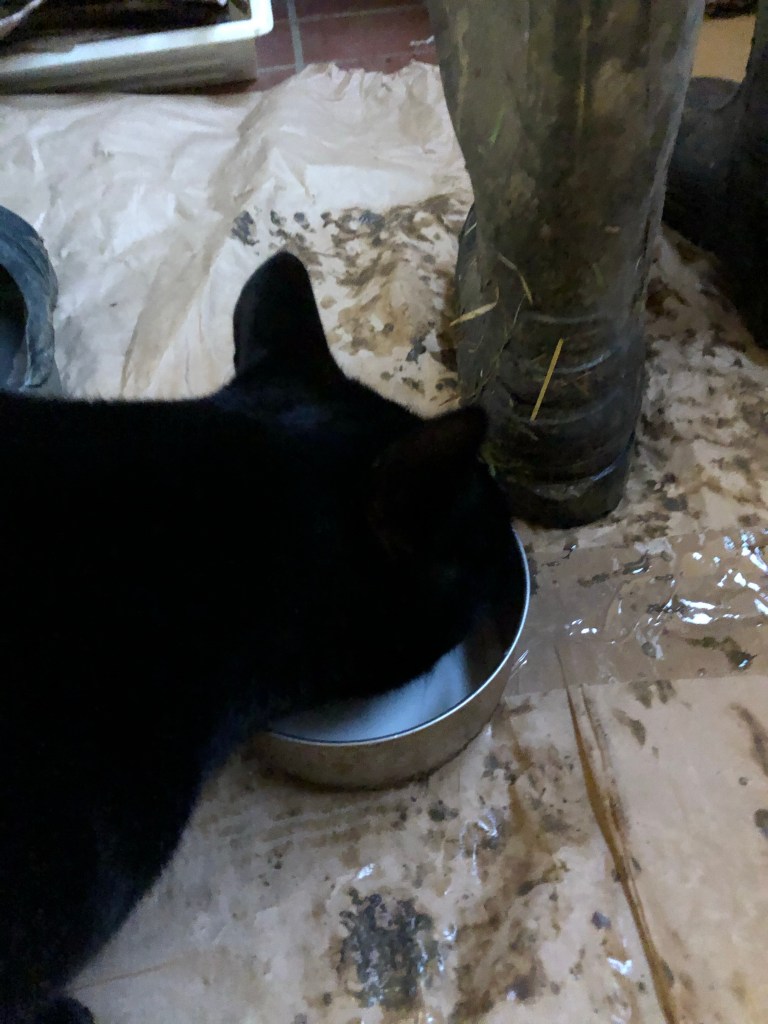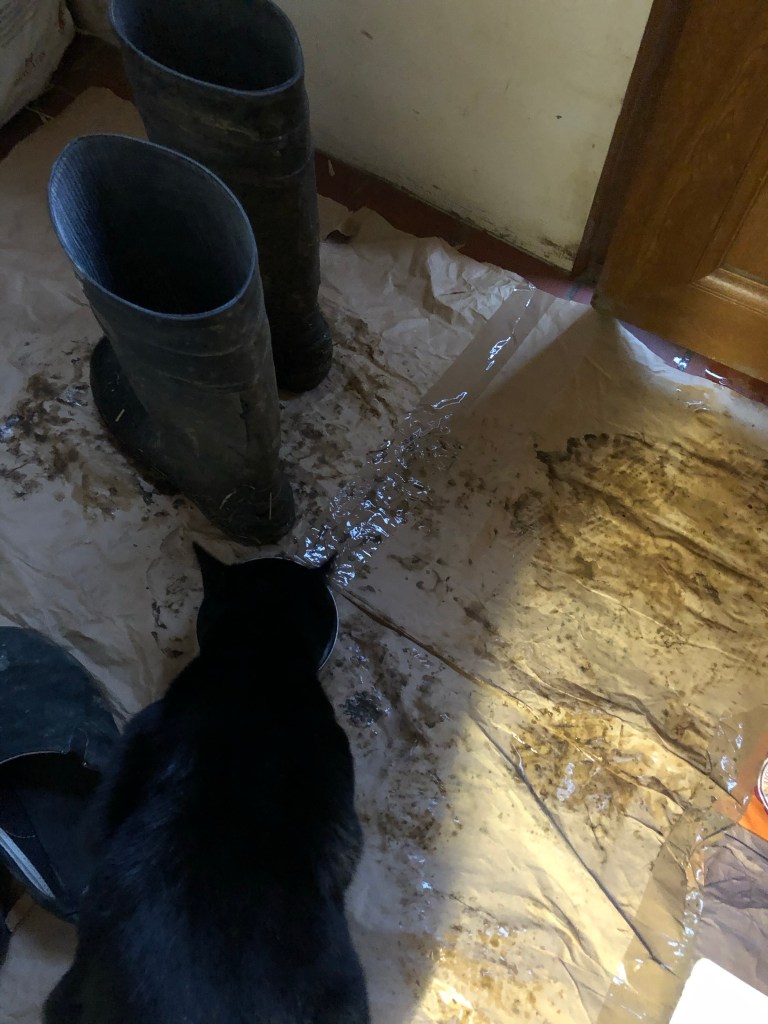 He loves his morning saucer of goat milk. He accompanies the milker to the milking parlour and trots behind the full pail and the “strip” cup and whoever is carrying them. The “strip” cup is what we use at the beginning of the milking to check that the milk coming out of the udder is free of any taint or impurities. This is the milk that Nigel gets each morning. But – this morning it is unrelentingly wet outside and warm and cosy indoors. Nigel prefers to be in the kitchen but also wants his milk. He stands by the back door trying to go out for the milk but the rain sends him back for cover. I gave in and put the milk inside the damp porch. If he could I am sure he would say “thank you”!