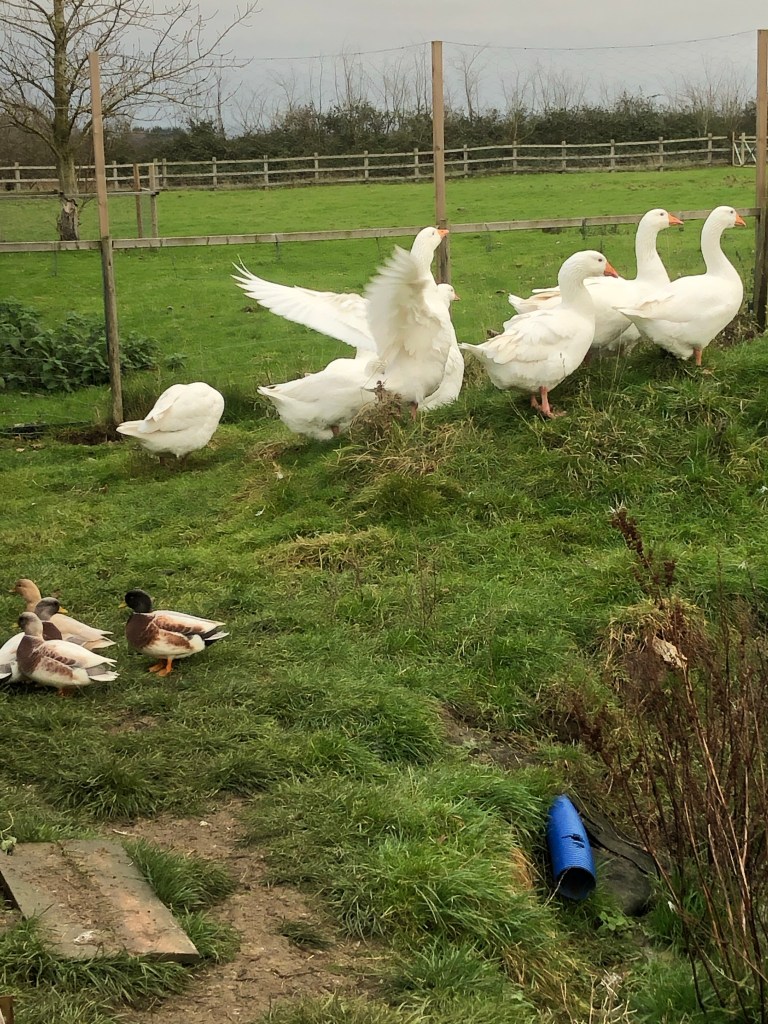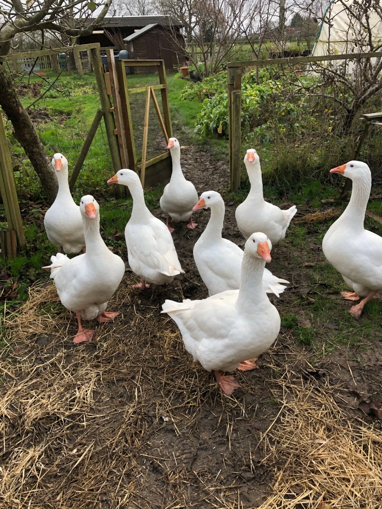 Another farmyard expression that rang true this afternoon as we drove the geese to the duck pond. One “silly goose” decided to go off in the wrong direction and J had to chase after her and carry her under his arm .
