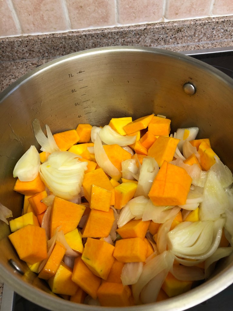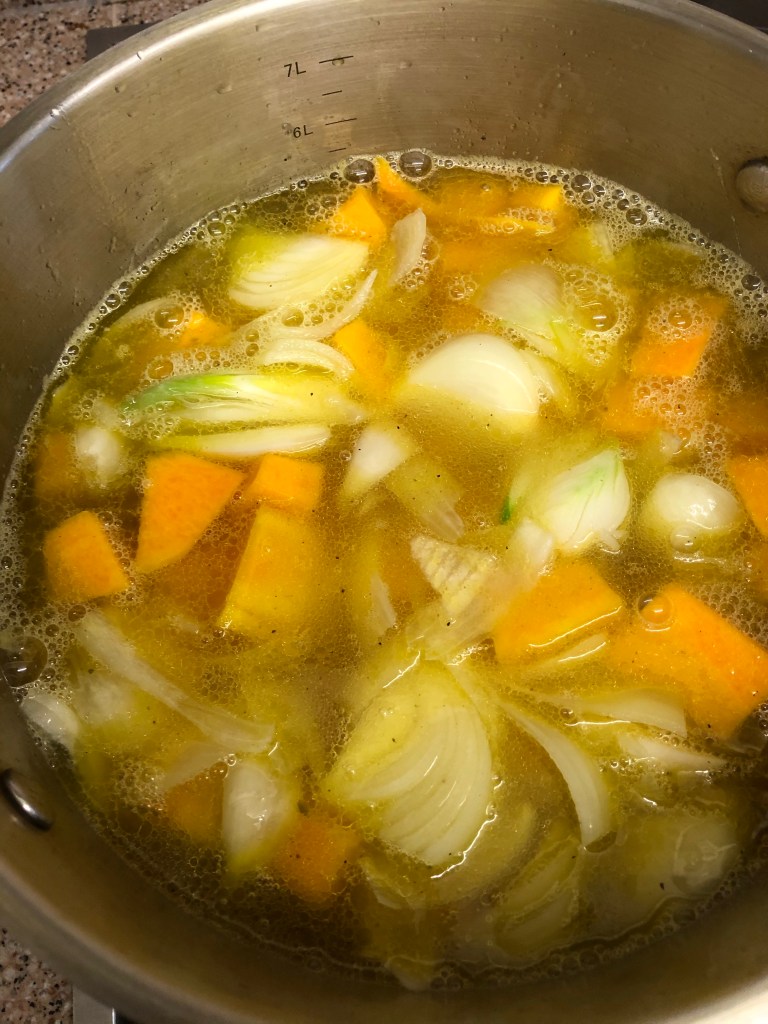 The last butternut squash was stored in the onion barn. We brought it to the house to make it into soup. It’s so enormous that I have only used a third of the squash so far.