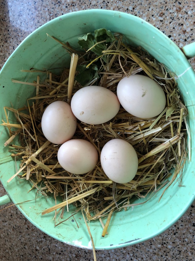 The Banties and Silkies have settled into their new quarters. Jeremy built them a wooden perch and a deluxe nest box. Last week they ignored the box but this morning there was a happy discovery