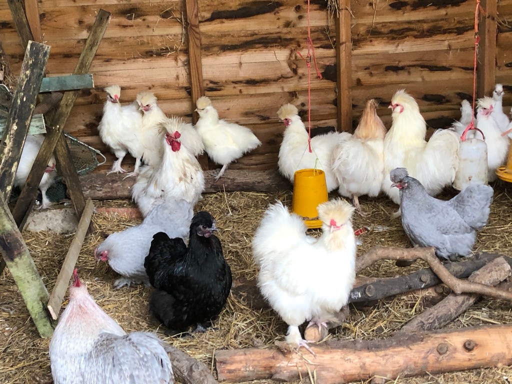 The Bantie and Silkie cockerels have stopped fighting. All the adult birds pick on the Silkie chicks, but just to put them in their place and not to hurt them.