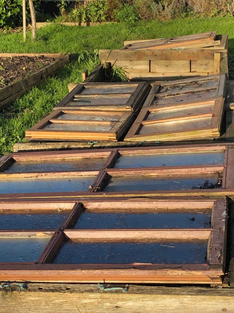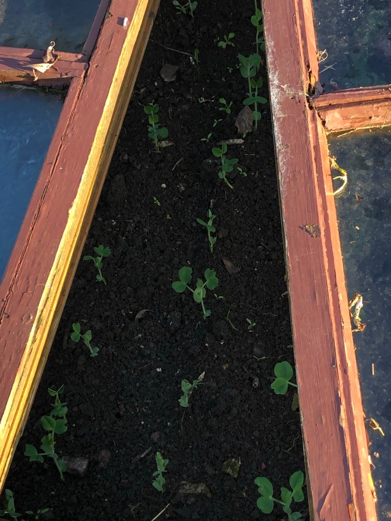 In the raised beds peas are popping up under glass frames made of old windows
