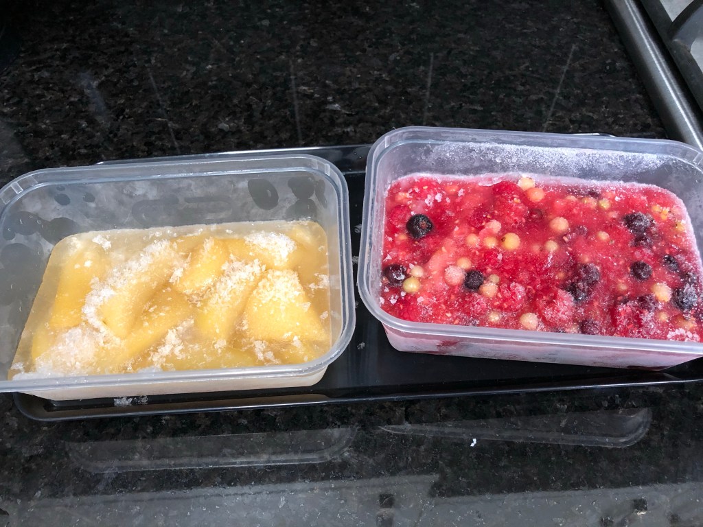 We are gradually using the food that is in the freezers. Today I am defrosting summer fruit compote and also pears poached in wine.