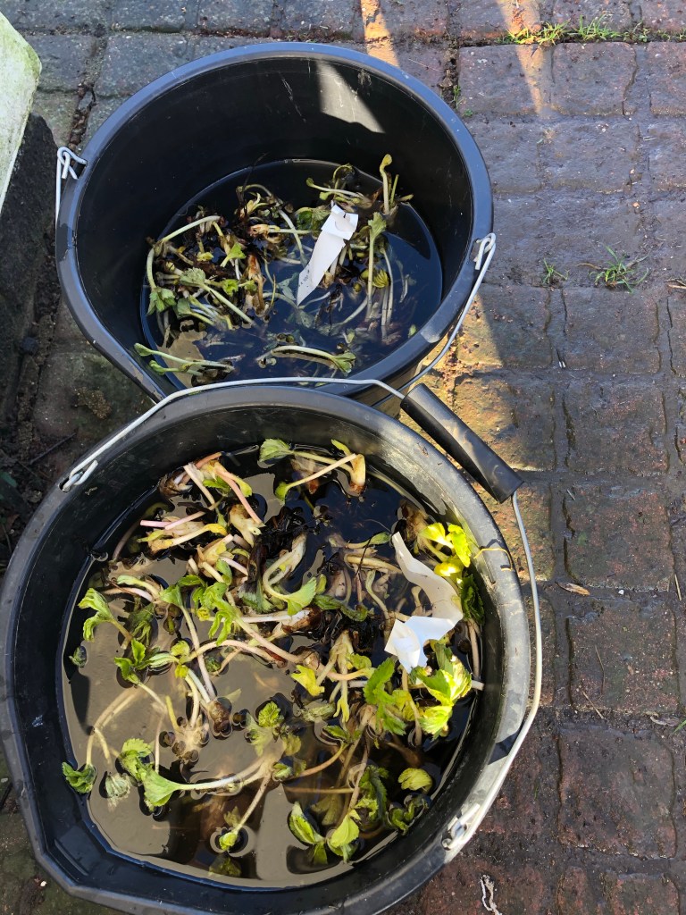 Unexpectedly early, 200 strawberry plants arrived late morning. We weren’t expecting them until after the holidays so it’s a race to prepare the grow bags in the poly tunnel. For now the plants are rehydrating in buckets