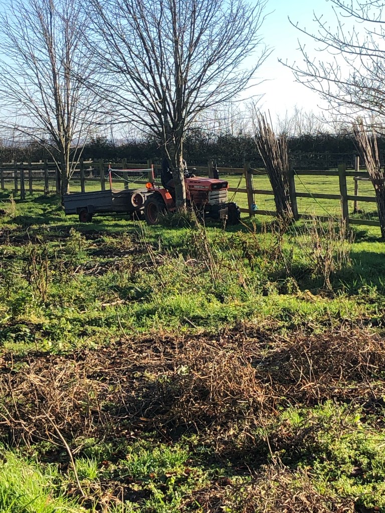 J drove the tractor and trailer (loaded with bags of compost) down the garden and stacked them outside the polytunnel.