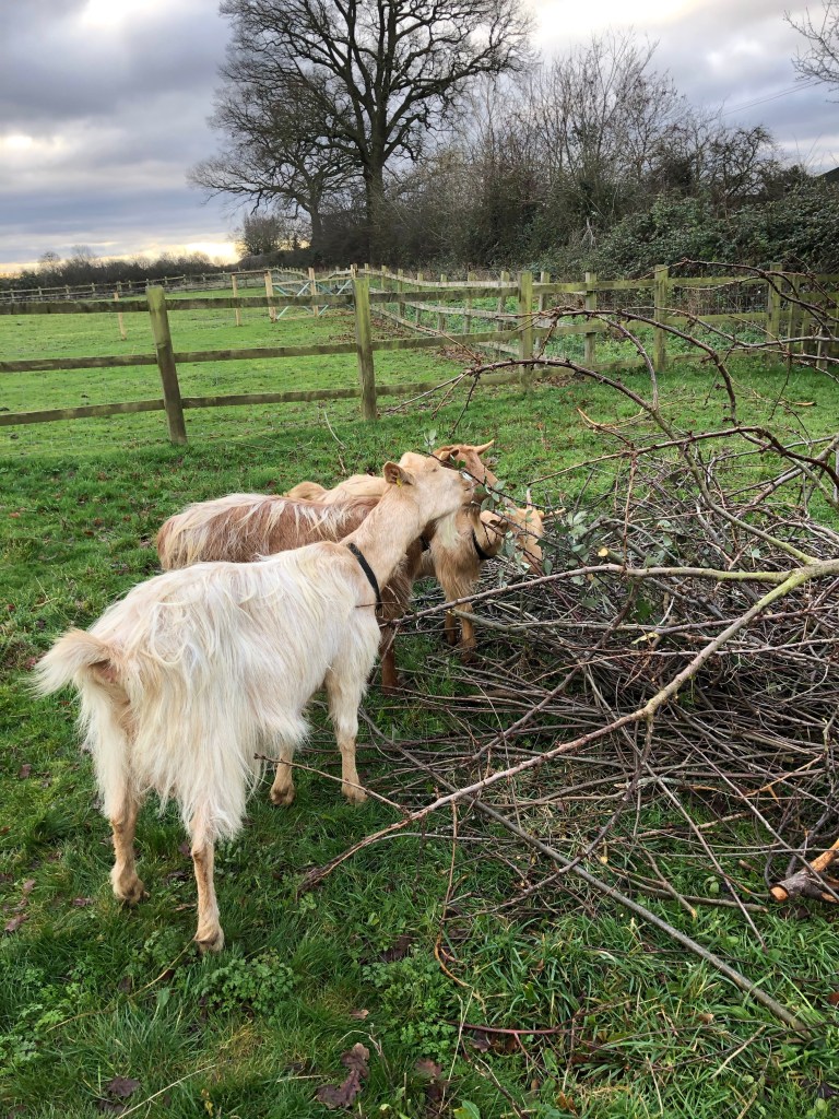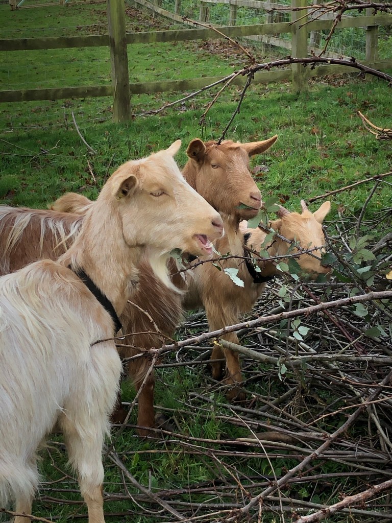 J is pruning the fruit trees this week and the goats pick over the branches. Goats need forage as well as hay and concentrated and grass.