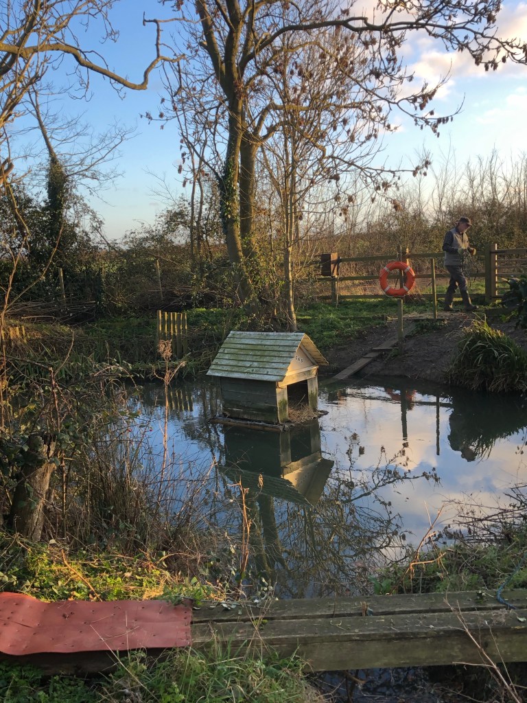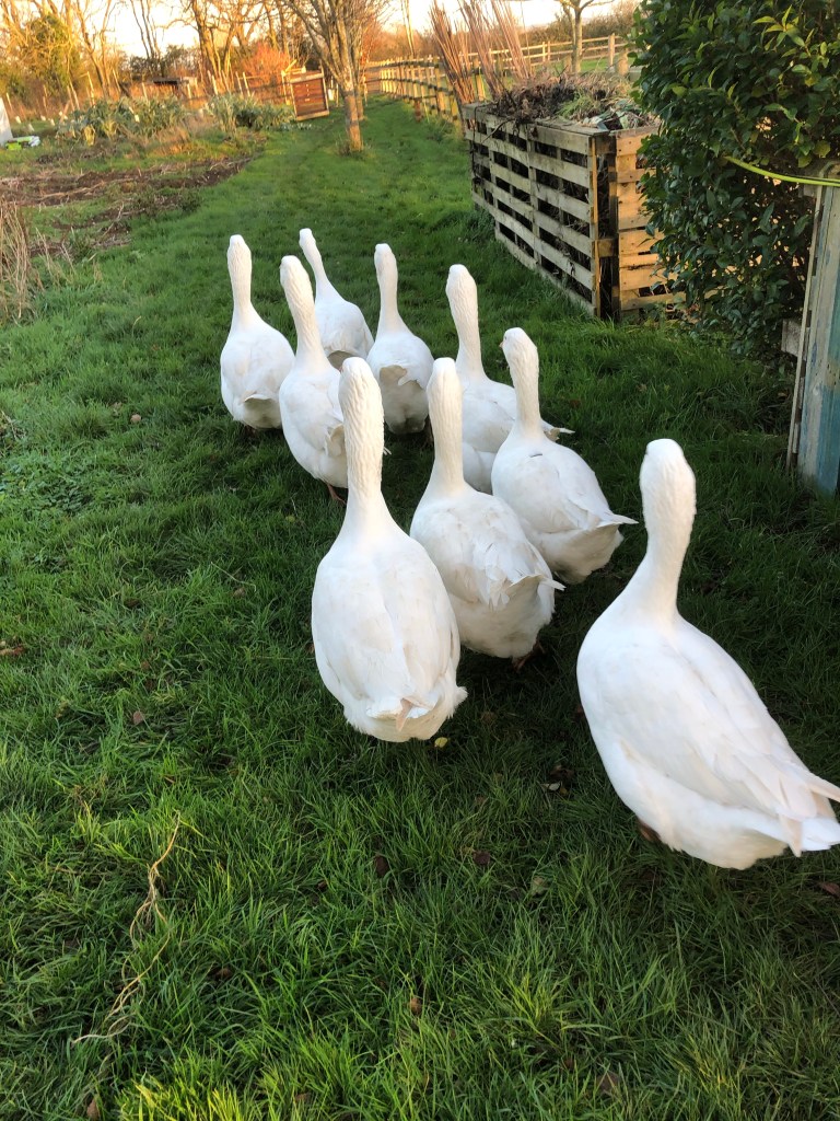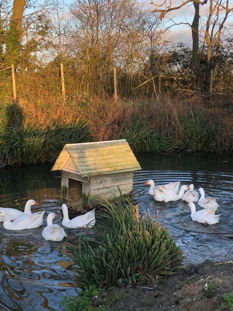 The goose pond and it’s surroundings got a good “haircut” this afternoon and J repaired the floating duck/goose house and relaunched it onto the water. The geese have moved back to their pond and got straight in for a bracing swim.