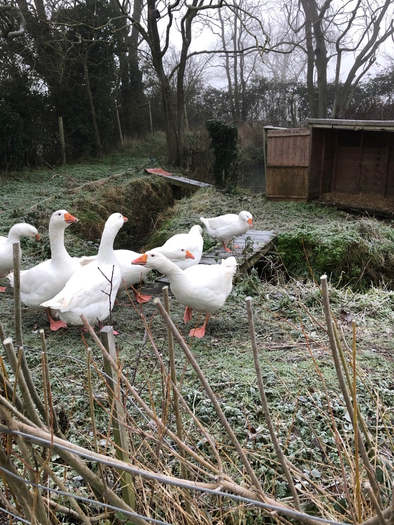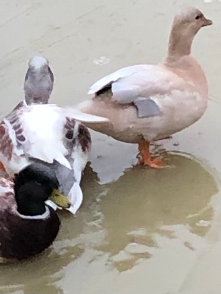 The ducks emerge slowly, reluctant to leave the warmth of their straw strewn house. I know that they will get a surprise when they try to swim on the icy pond. They will find themselves “walking on water” until (very quickly) the heat from their little bodies turns the ice to liquid