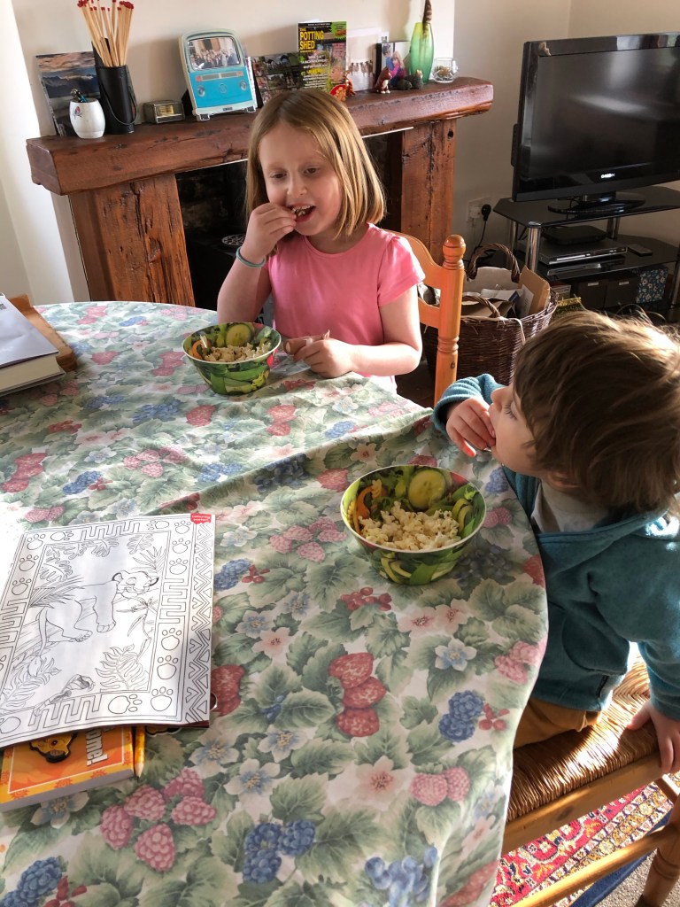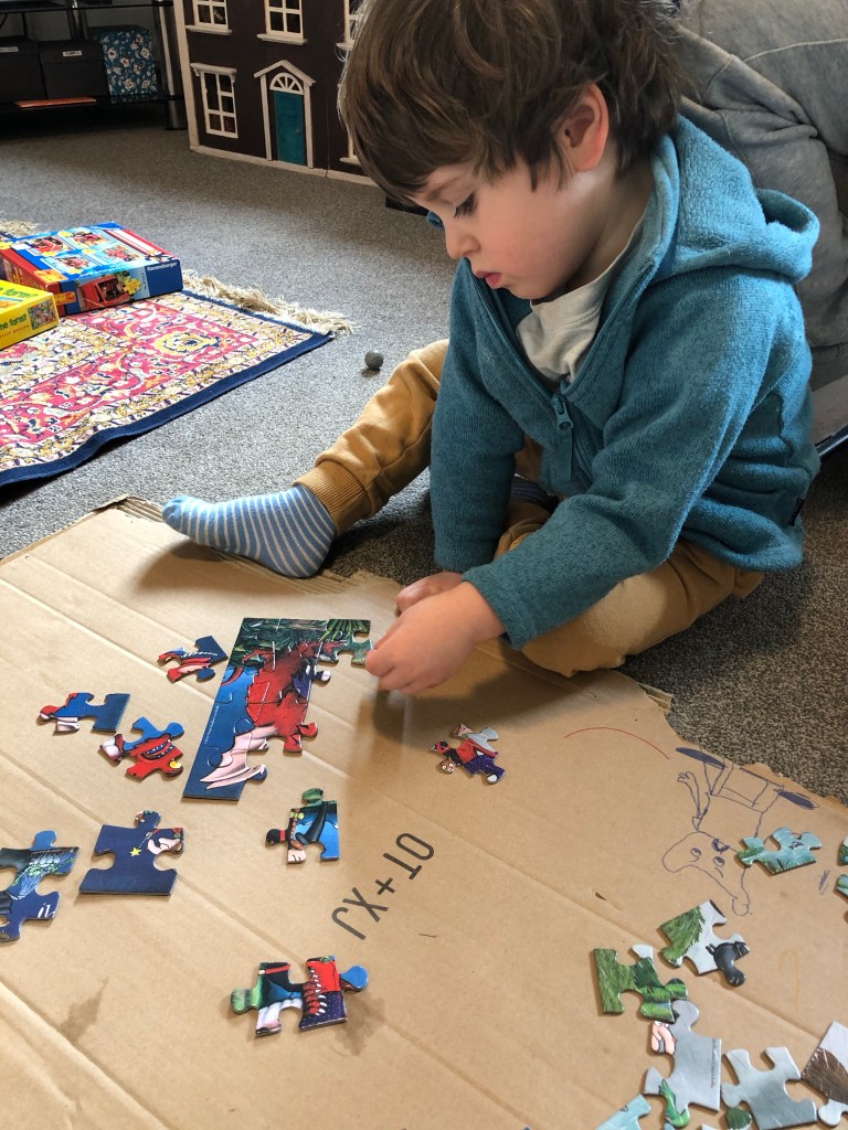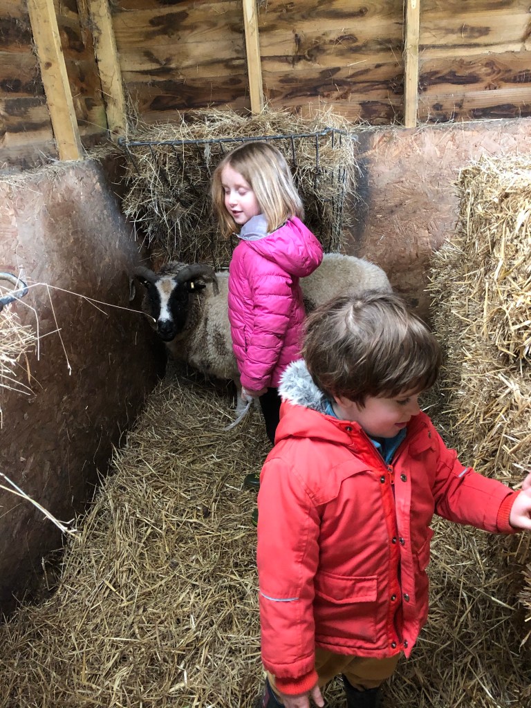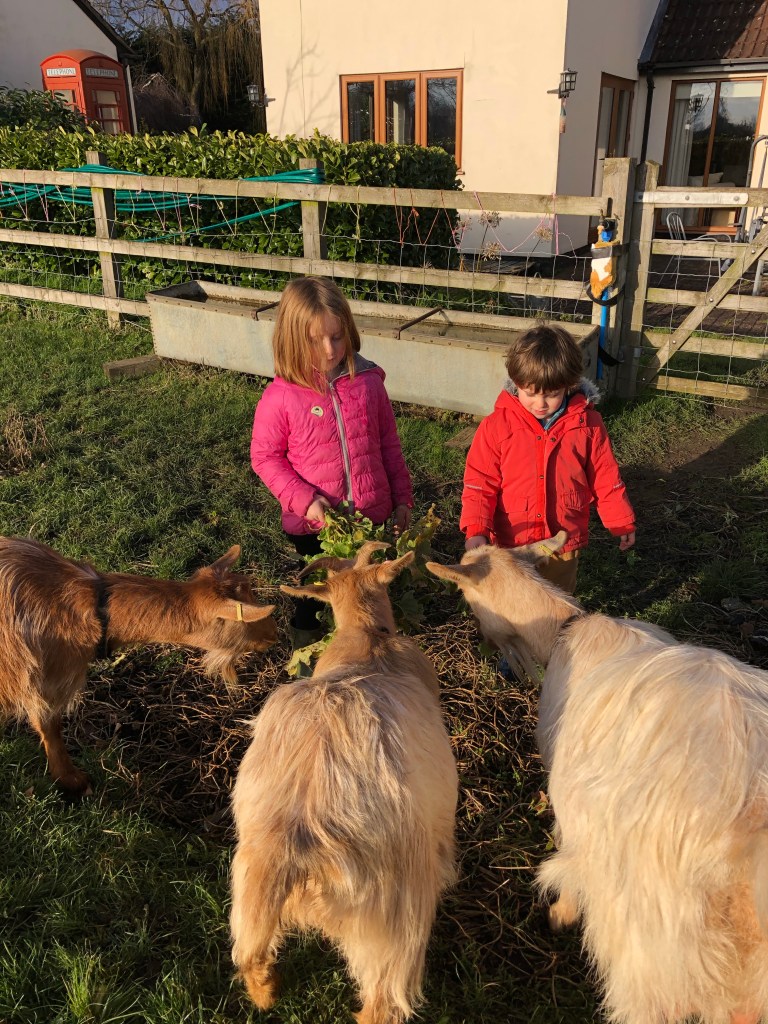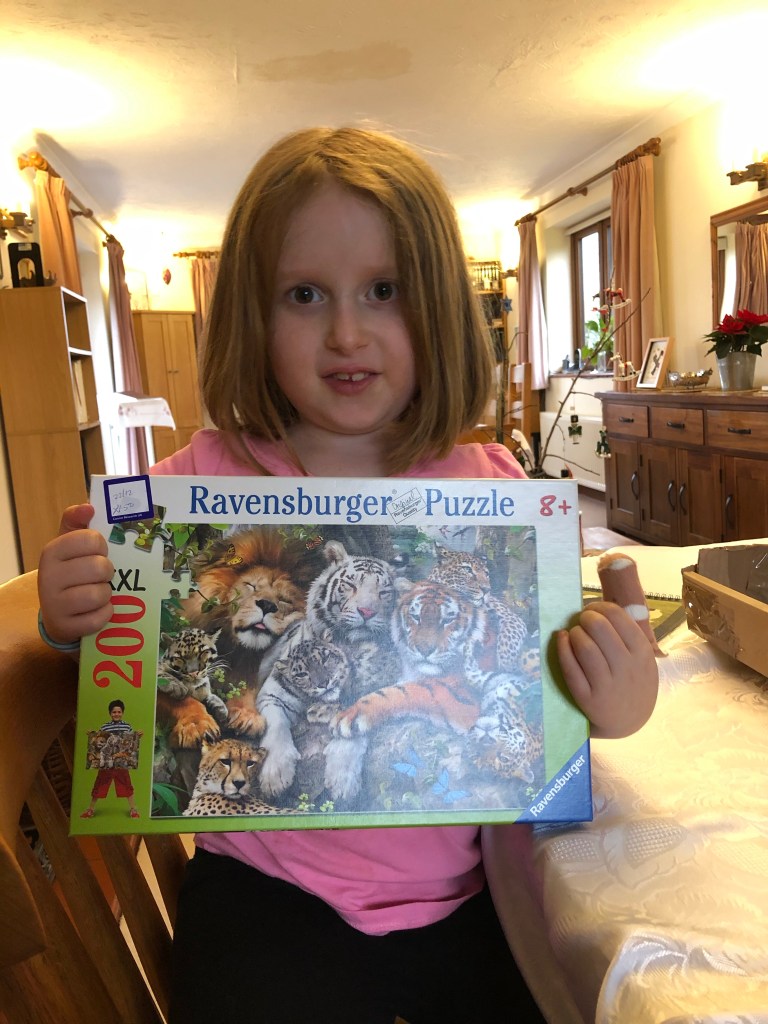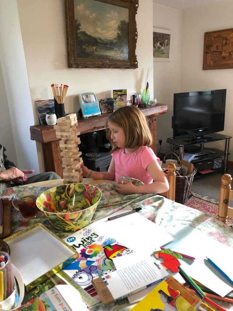 Home made sweet and salty popcorn A game of Jenga with grandpa Visiting Perky in the barn. She has a poorly hoof that J treated this morning Weekly treat of kale fed by the kids to the …..kid and nannies This puzzle will take three or four sessions Both children love puzzles. I stocked up on quite a few from the charity shops before we went into the current lockdown