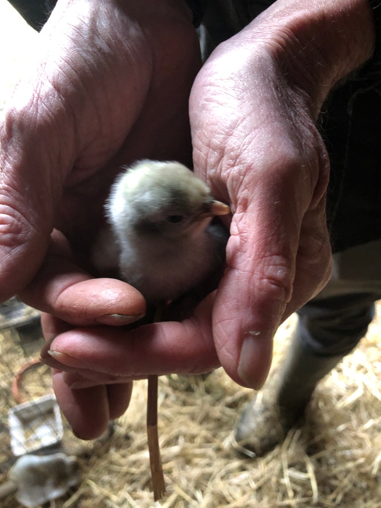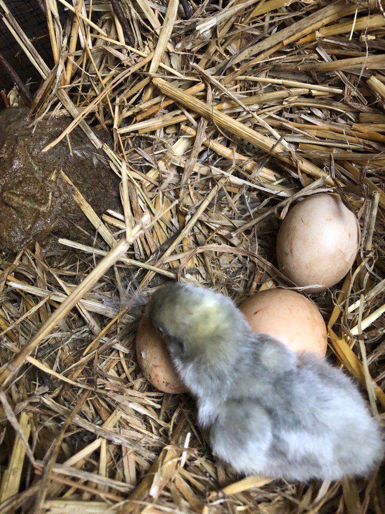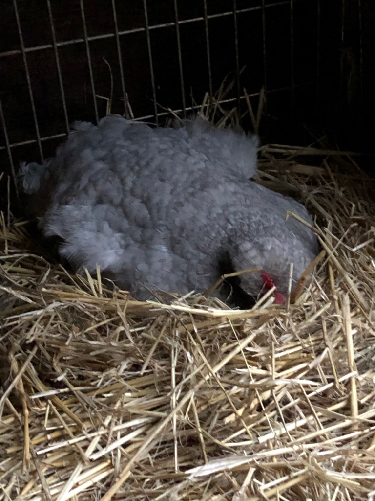 The grey broody Silkie has hatched a little grey chick this afternoon. She still has three eggs beneath her warm feathers so there may be more