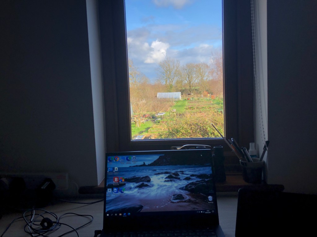 My lovely husband has made me a desk and bookshelves in the space outside our bedroom at the top of the stairs. The desktop sits just under the windowsill and I have a view of the garden just in front of my laptop. It’s a wonderful distraction from writing my magnum opus, especially as I have a decent pair of binoculars at hand to study the birds that wander up and down the pathways and fly into the trees.