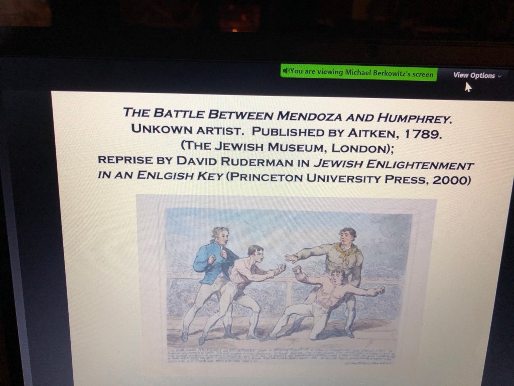 A whirlwind hour by Professor Michael Berkowitz organized by the online Leeds Literary Festival. The subject was Jewish boxers in America and England. There were many indeed. One of the most famous English boxers in the 18th Century was Daniel Mendoza whose story so intrigued me that I have just ordered a book by Wynn Weldon called The Fighting Jew, the life and times of Daniel Mendoza, Champion Boxer.