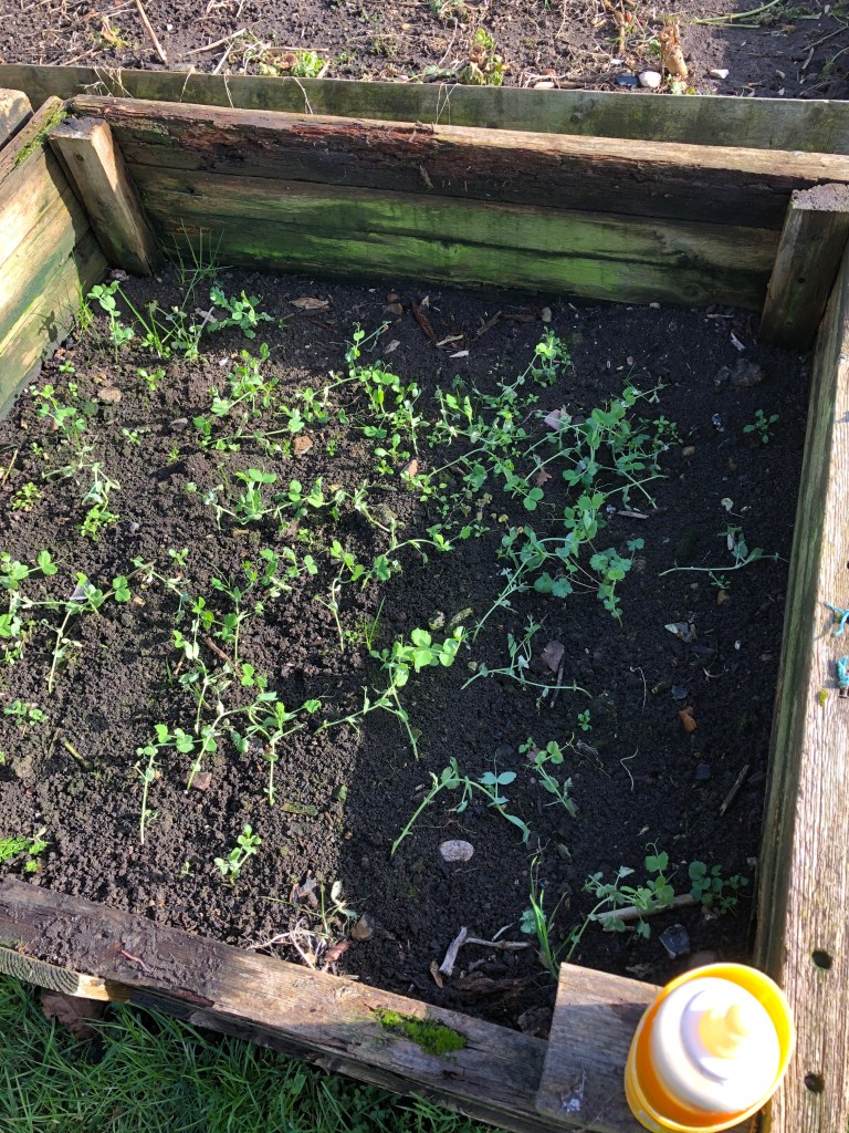 Outside it has changed, overnight, from biting winter weather to sunny, spring sunshine. Time to take the glass off the pea plants growing in the wooden frames