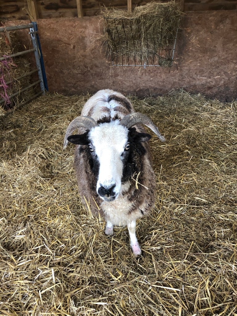 Little Miss Pretty has had a difficult winter. Plagued with hoof troubles we regularly brought her into the barn for treatment. Then, when her hoof had healed, she gave birth to a stillborn singleton lamb. she was sad and lonely. We put her in with Tufty and they kept each other company until all the ewes had lambed. Now the flock has been reunited and Little Miss Pretty is surrounded by growing lambs. Yesterday I noticed that she was once again limping. We have brought her into the dry barn where we will look at her hooves and treat them.