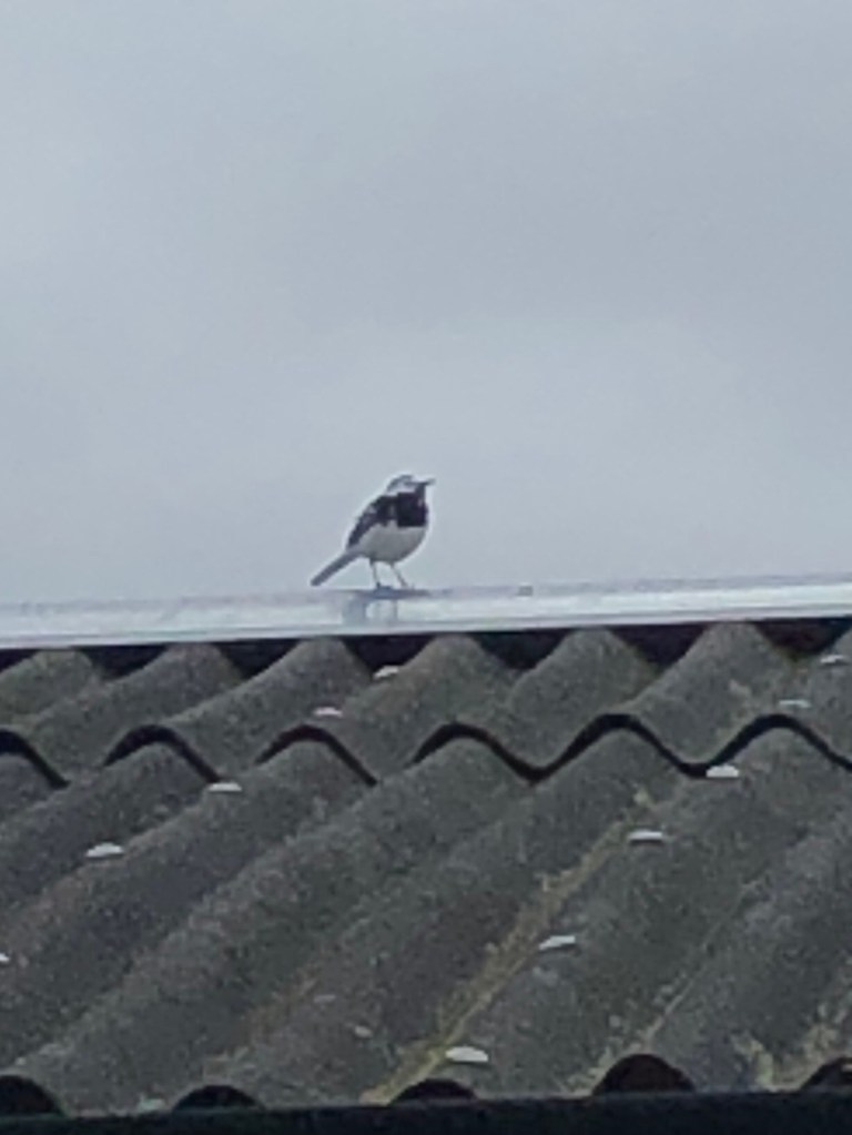 When I got home I fed Lambikin (more than the calf wants to suck the cow/human wants to give suck/give a bottle!). There are a few pied wagtails around the garden and last year one pair nested in the barn. This one was sitting on the barn roof just now. Maybe they will nest there again