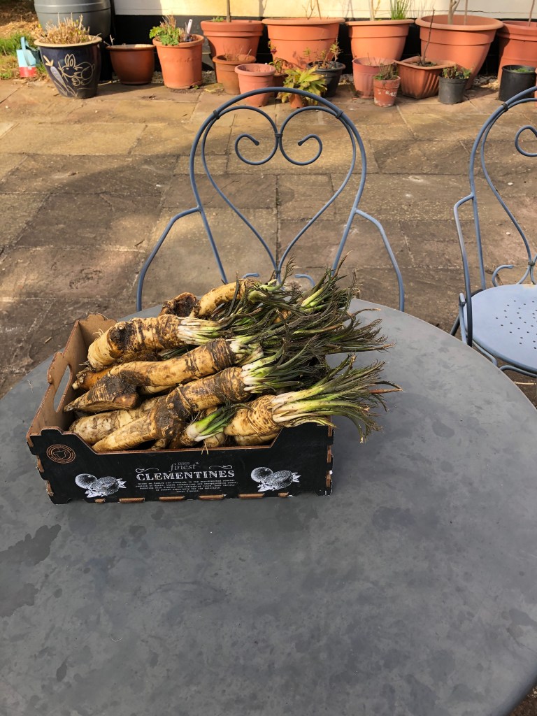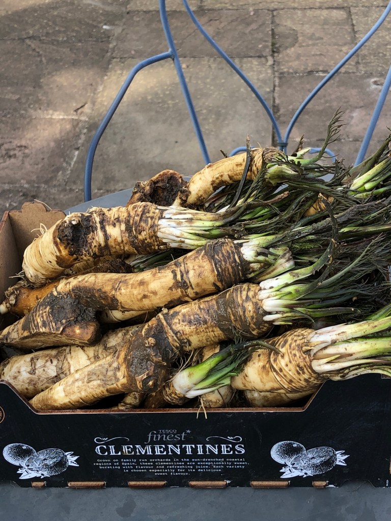 Plenty more food to cook and freeze or refrigerate before Friday including this home grown and very strong Maror (horseradish) which we eat grated in unleavened bread and also covered with Charoset (a sweet paste made from almonds, wine and apple) to remind us of the bitterness of our enslavement under pharaoh in Egypt and of the bricks we had to produce daily – perhaps the ones that built the pyramids.