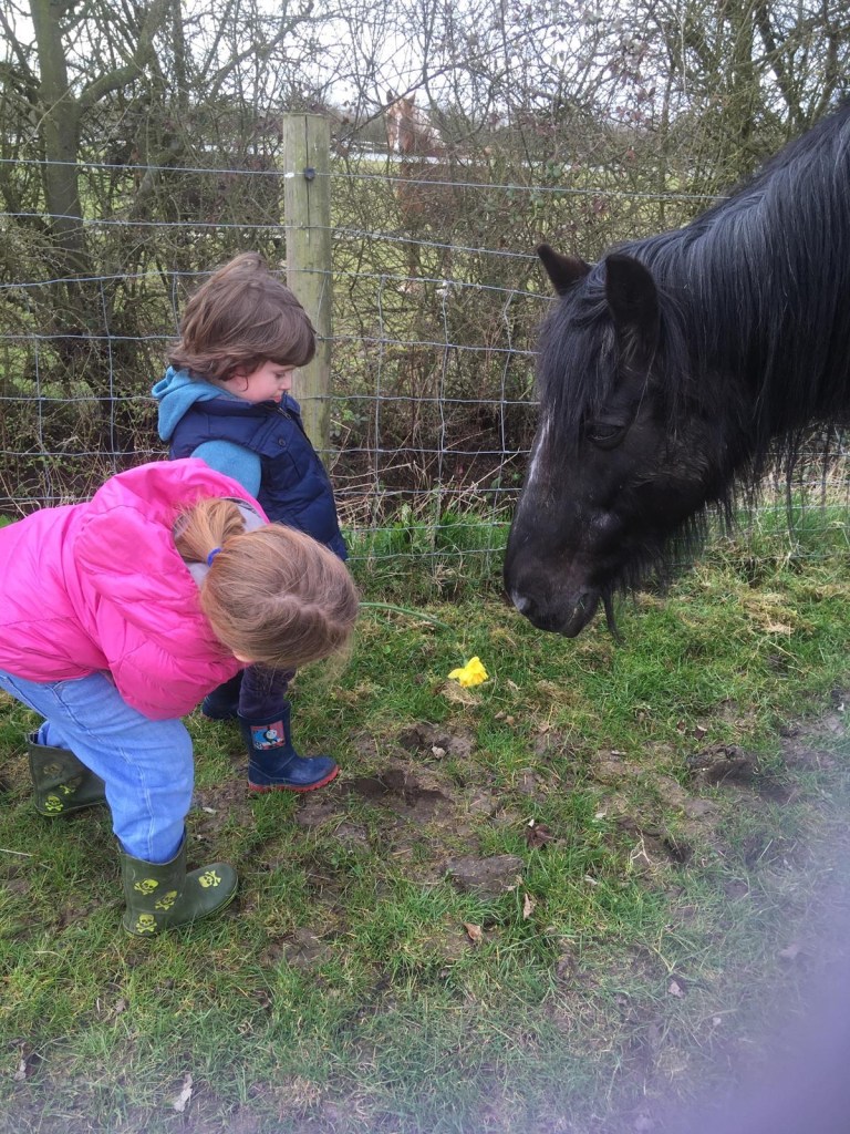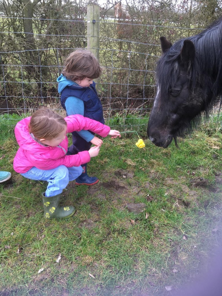 We did walk over the road today to see Bella’s baby calf and the children also met Minnie the 30 year old Dales pony. She’s a gentle giant. Her mistress took these photos and sent them to me