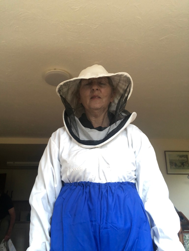 I said that I wouldn’t help – but that was before they arrived. Thanks to friend Kate I have her old beekeeping suit and on it went