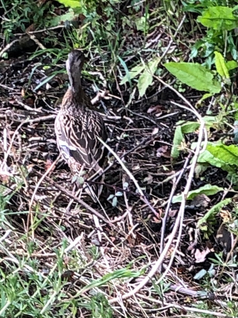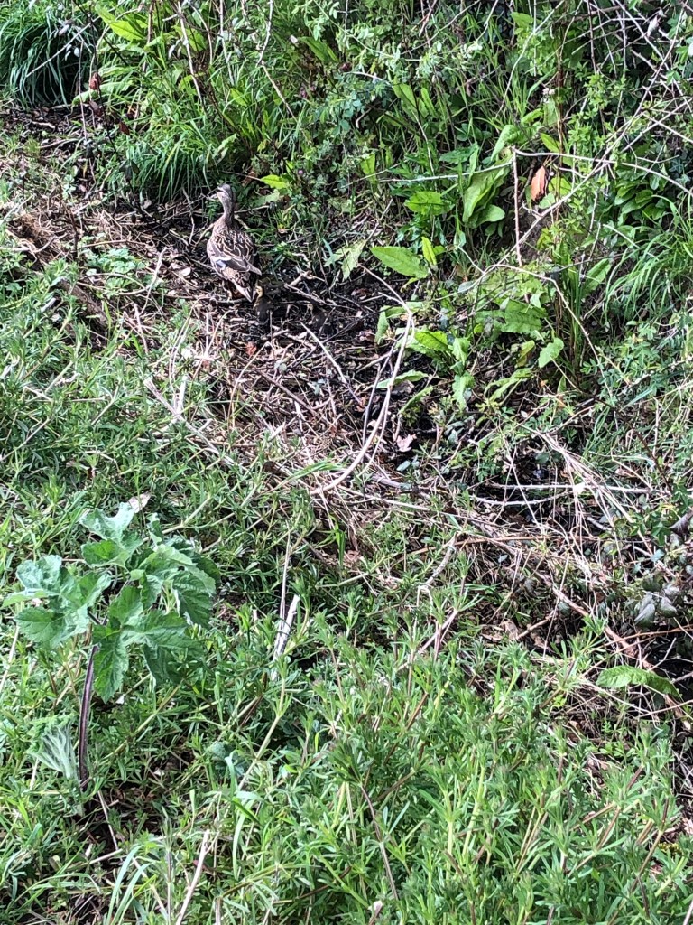 I drove fifty yards along Mill Road and caught sight of Mrs Wild Mallard Duck leading her ducklings into the field next to the pond. I stopped the car (from where I am typing now) and jumped out. They were hiding in the grass until I disturbed them and ran away through a gap in the hedge towards our pond.