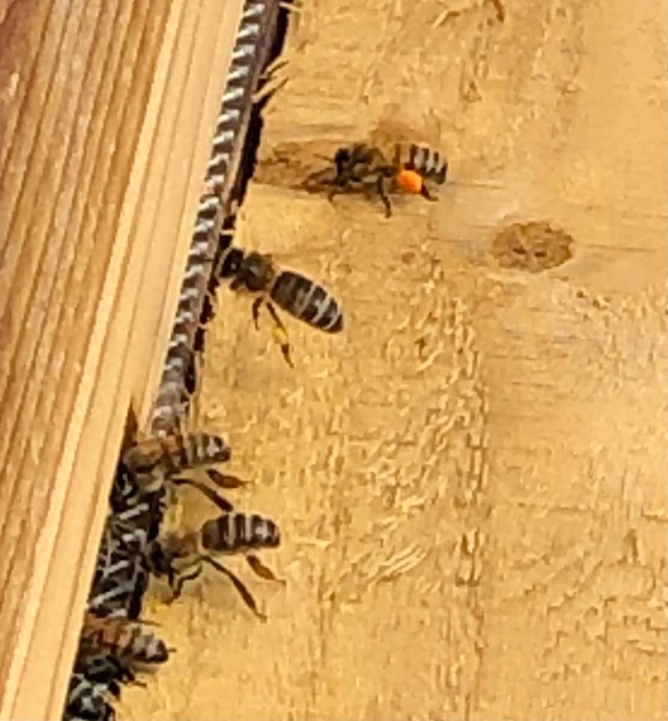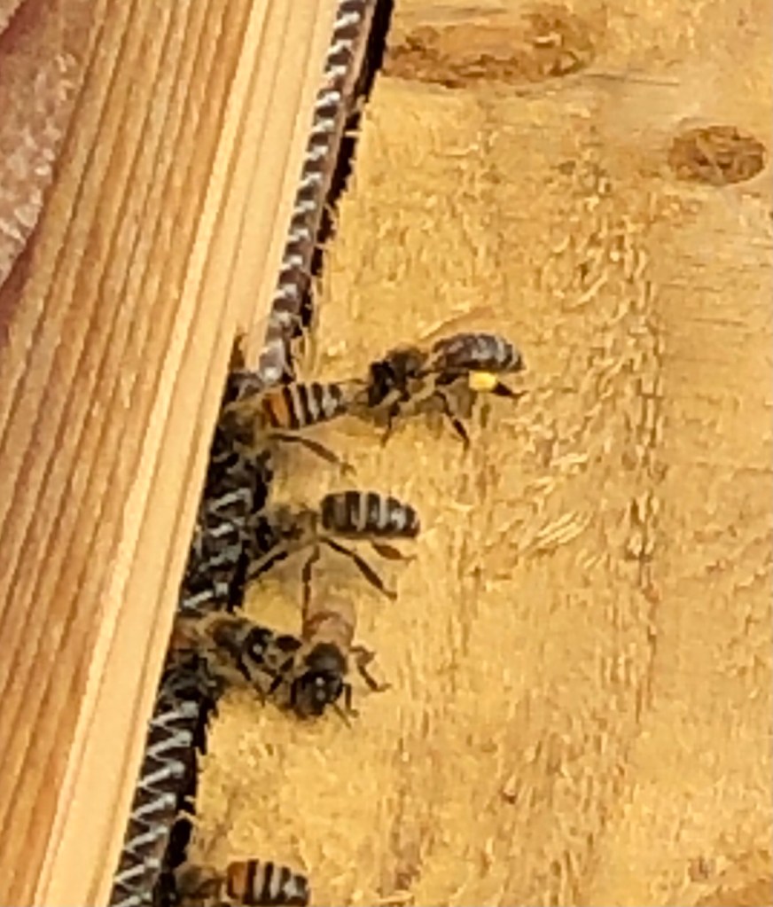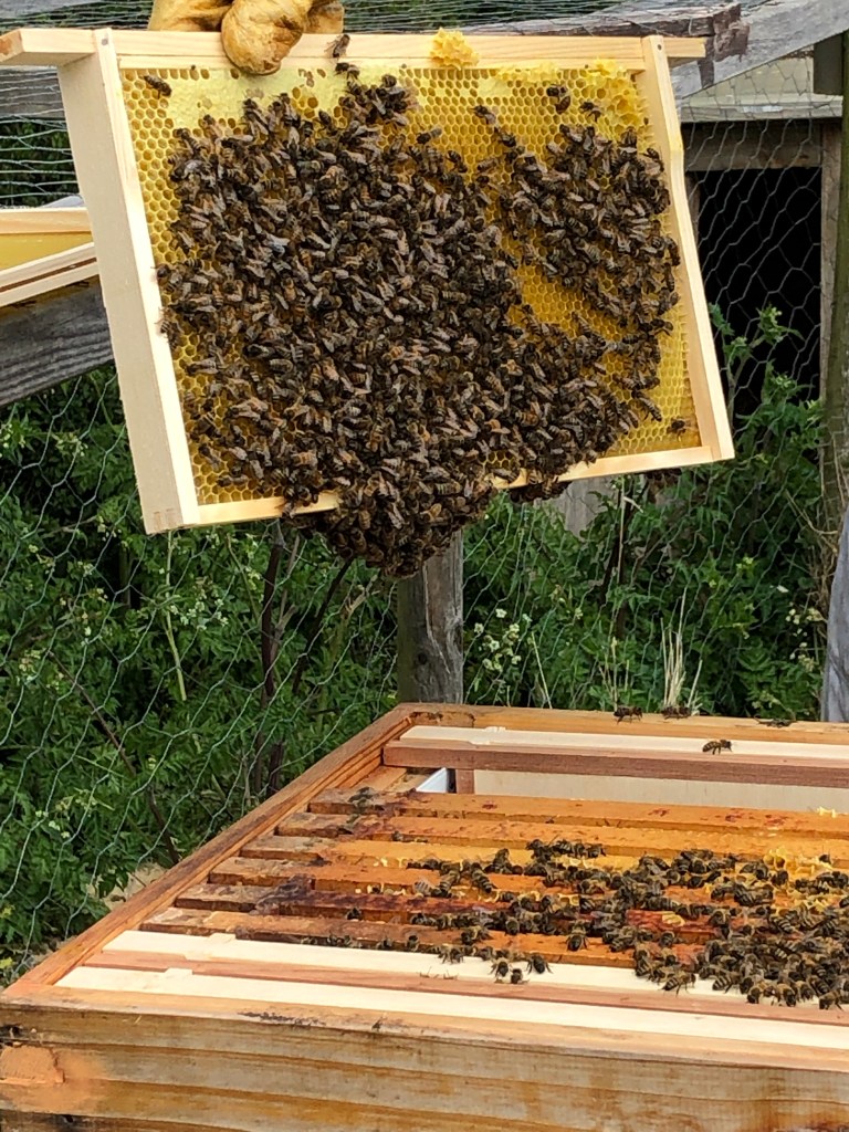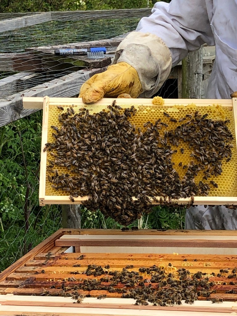 Jeremy opens the hive and inspects the frames We looked fir the Queen but couldn’t find her The worker bees go out foraging for pollen and nectar. The orange pollen comes from willow The yellow pollen come from rape plants – there are several bright yellow fields full of rape flowers within the three mile flying limit of Jeremy’s bees