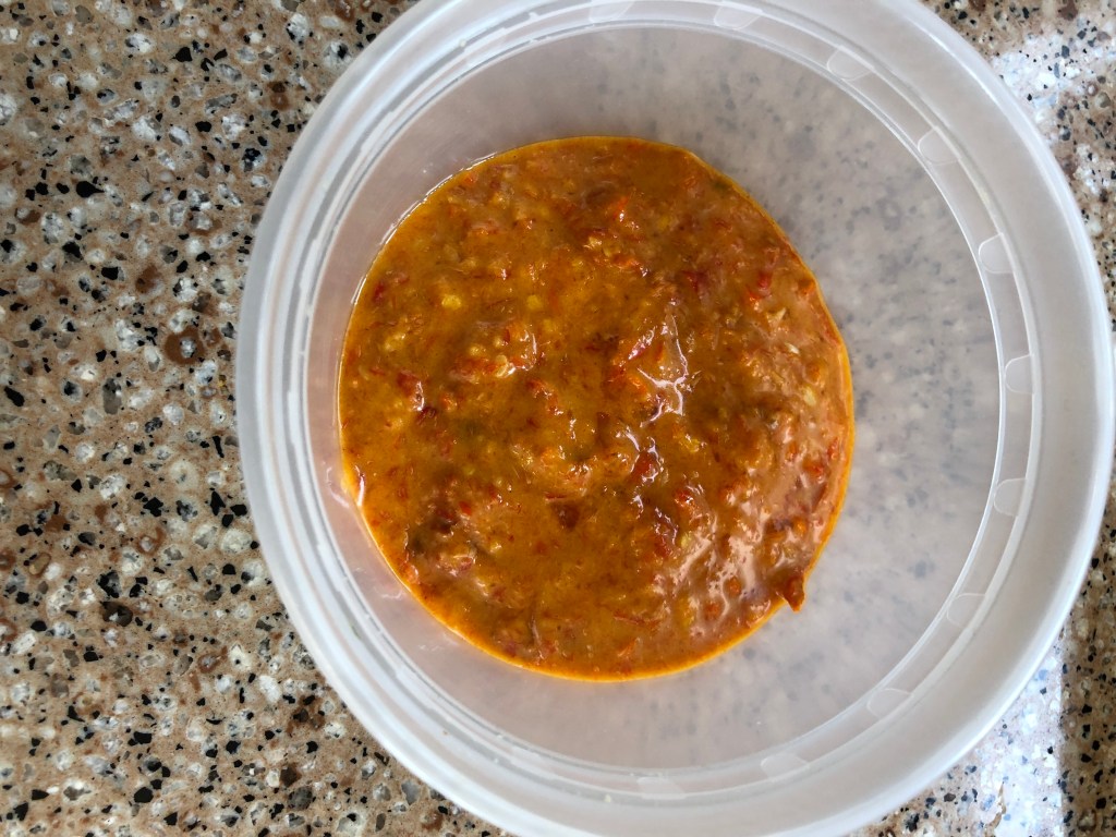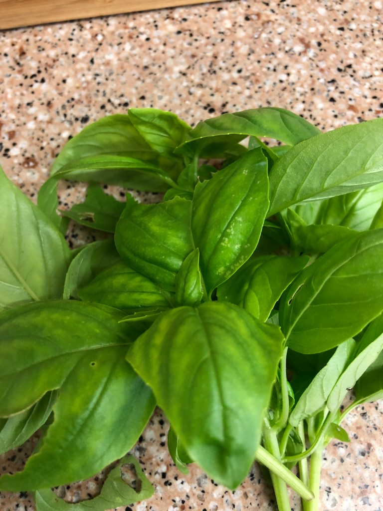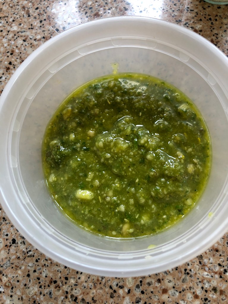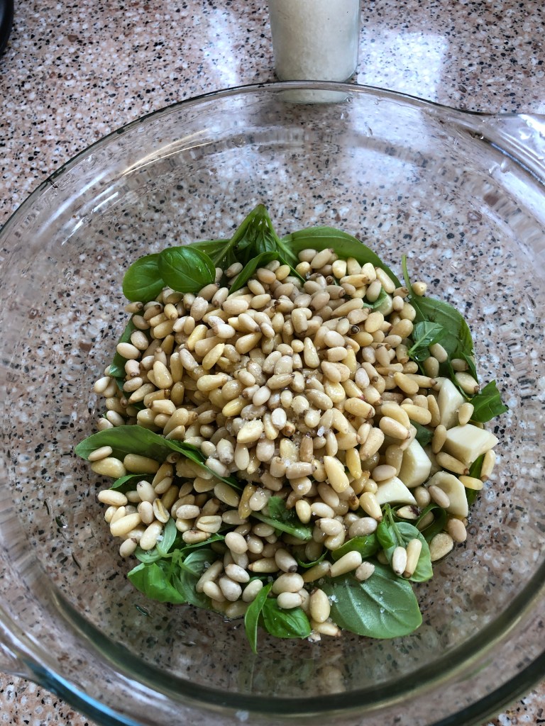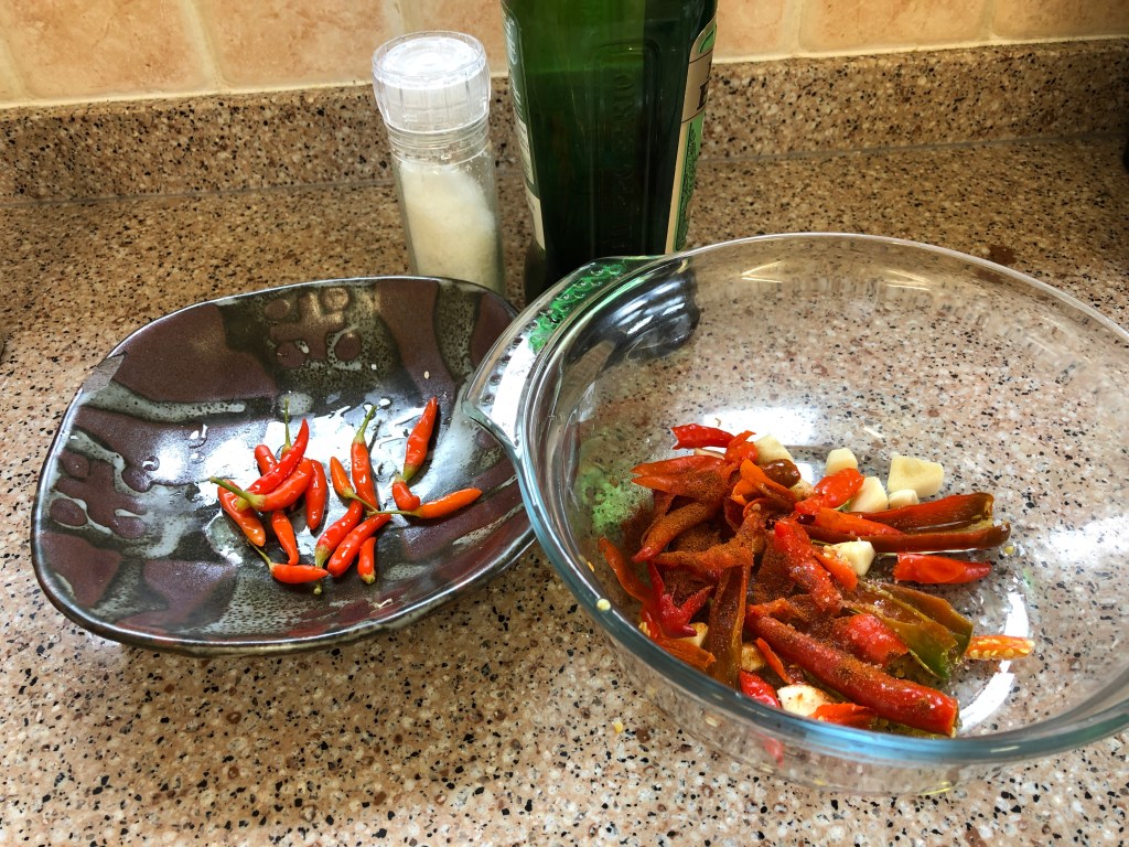 Rehydrated chilli peppers stored in the freezer over winterMix with garlic, olive oil, salt and a teaspoon of honey – hot harissa Fresh basil aplenty from the greenhouseMixed with shop bought pine nuts, olive oil, garlic and salt Thursday night is pasta pesto night
