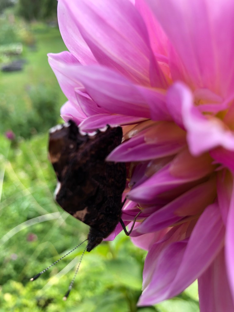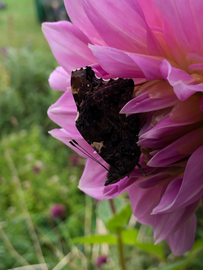 I noticed this butterfly sitting on a dahlia this morning. It was cold and drizzly weather and the butterfly was motionless
