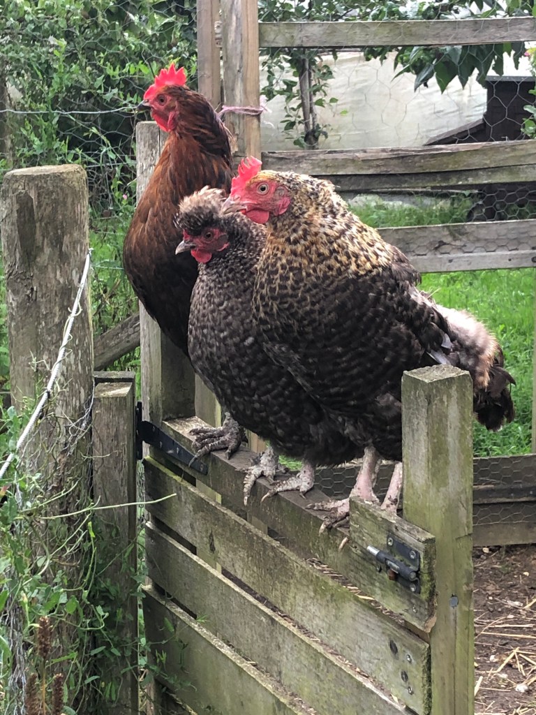 The more than an hour that I spent in mum’s room chatting away and, yes, laughing too. We discussed the beehives and mum wanted to know how many bees are in the most productive hive. She shuddered when I told her there were 60000 bees just in one hive. We talked about all of mum’s grandchildren and the great grandchildren. We talked about dad and one of his accountancy partners of whom he was very fond (in their retirement they used to lunch together once a week and mum and I wondered what on earth they could have found to talk about. We will never know). I showed mum a photo of our cousin’s five month old grandson. We both agreed that he is quite gorgeous and definitely takes after our side of the family!!! It was a truly happy afternoon and, as I wheeled mum back to the lounge, I stopped to talk to two ladies who were playing kalooki in the hallway. I told them that I had spent hours playing kalooki with my grandma (mum’s mum) in my childhood and teens. I got home to find three hens perched on a gate